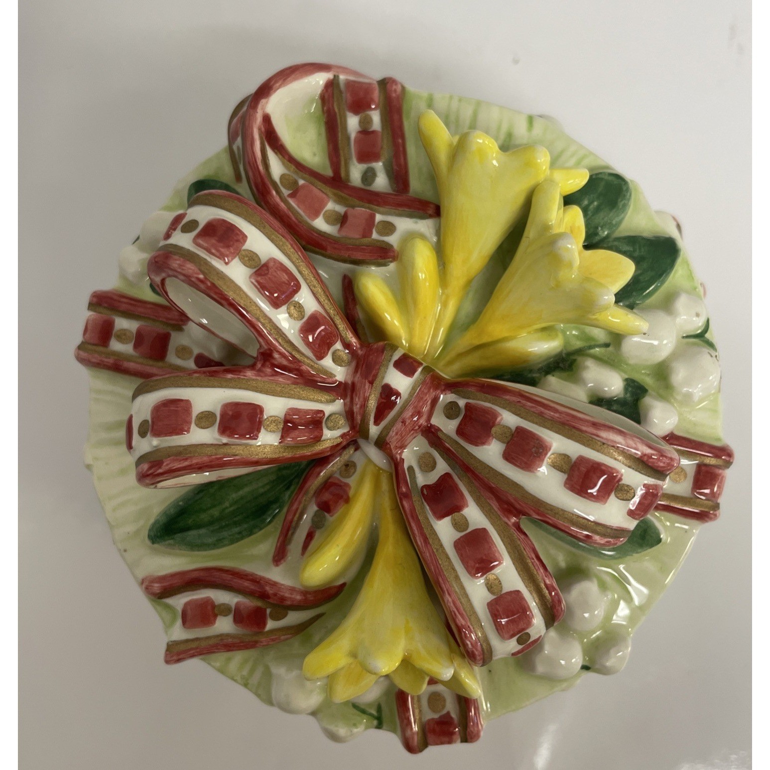 Unwrap a delightful surprise with this charming Fitz and Floyd trinket box! This ceramic treasure evokes the joy of receiving a beautifully wrapped gift, complete with a decorative bow and whimsical floral accents. Imagine the soft pastels and intricate details adding a touch of spring's vibrancy to your vanity, or the joy of storing your most cherished jewelry in this sweet keepsake. The glossy ceramic finish feels cool to the touch, while the hand-painted floral details add an artisanal touch. This charming piece would be a lovely addition to a cottagecore-inspired bedroom, a delightful accent on a sunlit windowsill, or a thoughtful housewarming gift for someone special.