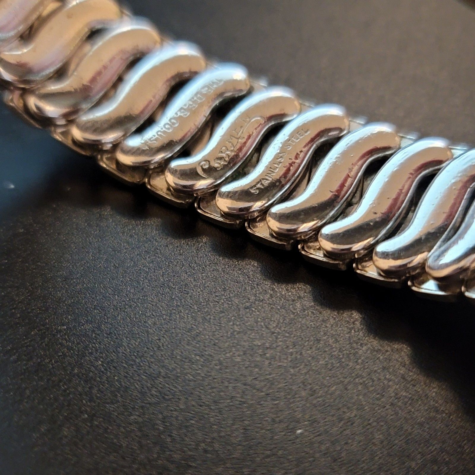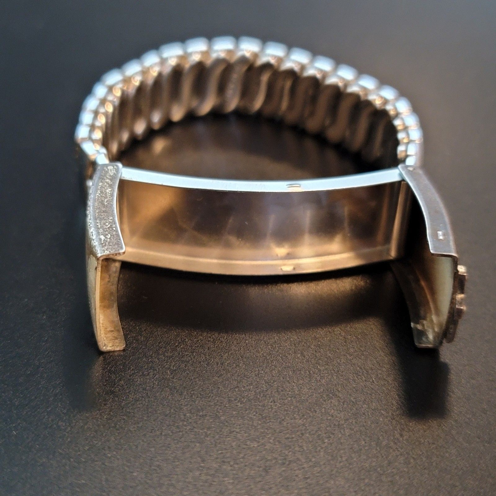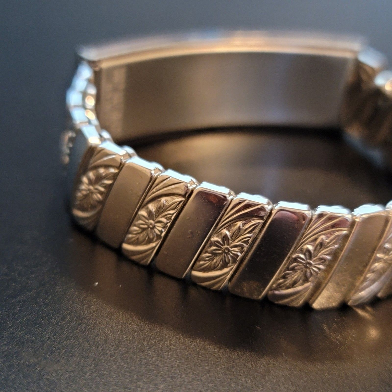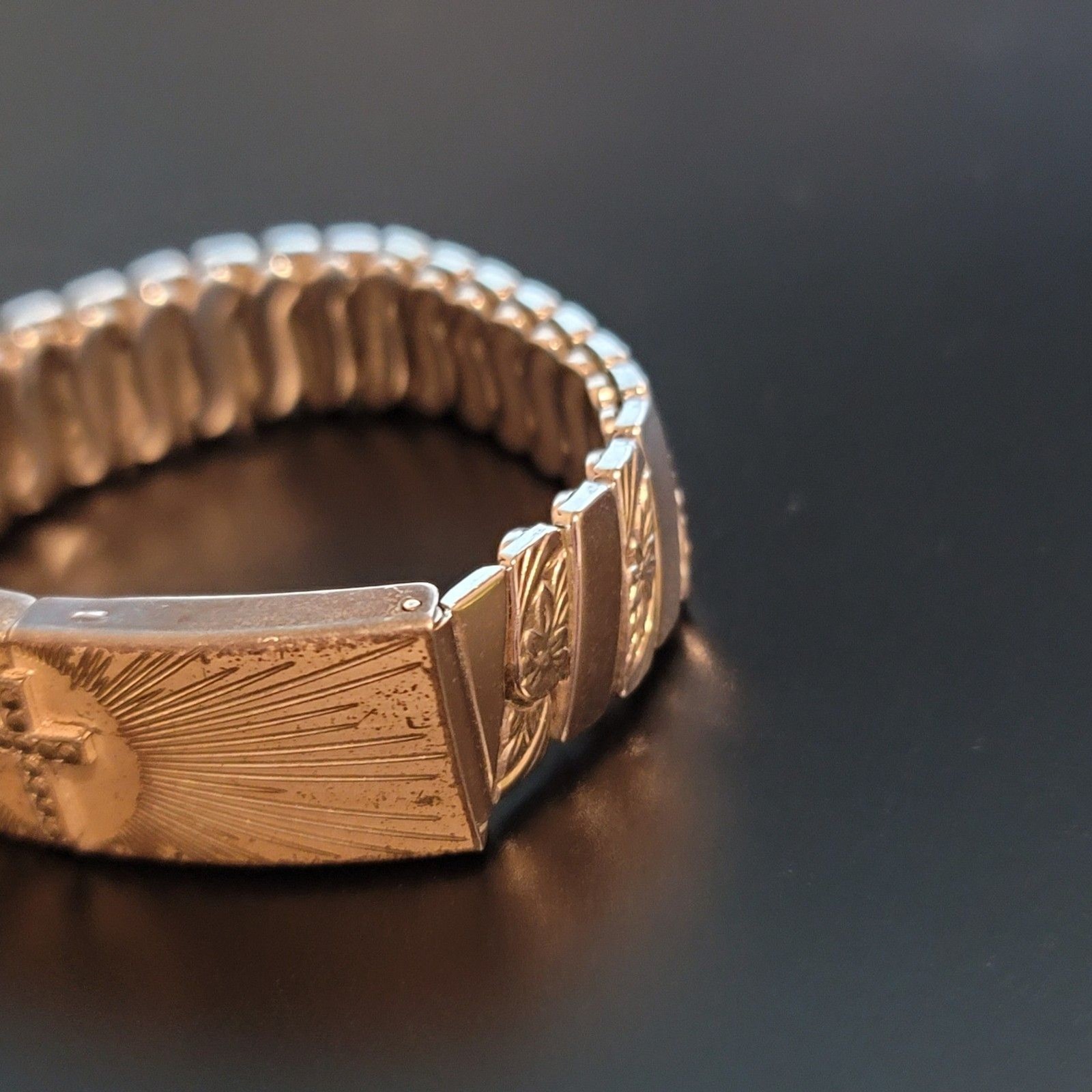 The flexible expansion style makes it comfortable and easy to wear, while the cross motif adds a spiritual and symbolic touch. Popular during the mid-20th century, these bracelets were prized for their quality craftsmanship and enduring style.