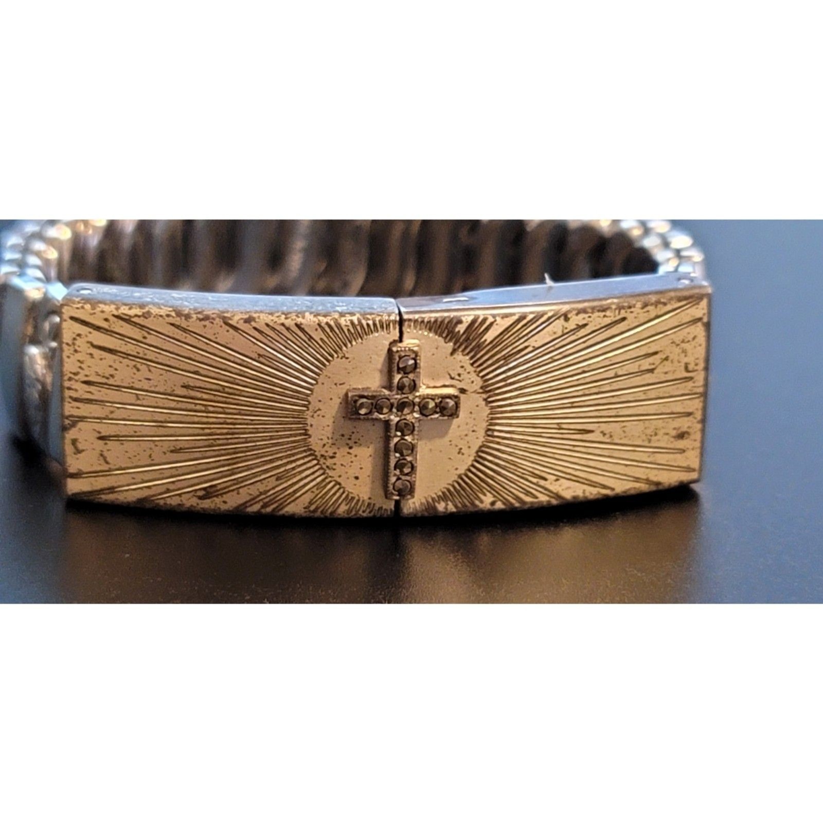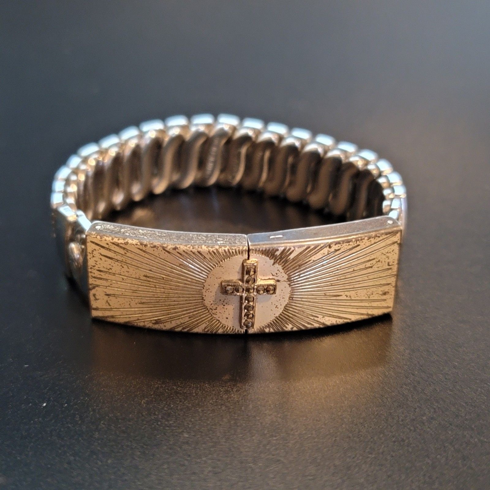 This vintage Carmen accordion bracelet combines durability with timeless design, featuring a stretchable sterling silver and stainless steel band accented by a gold-tone panel with a raised cross and radiant sunburst detailing.
