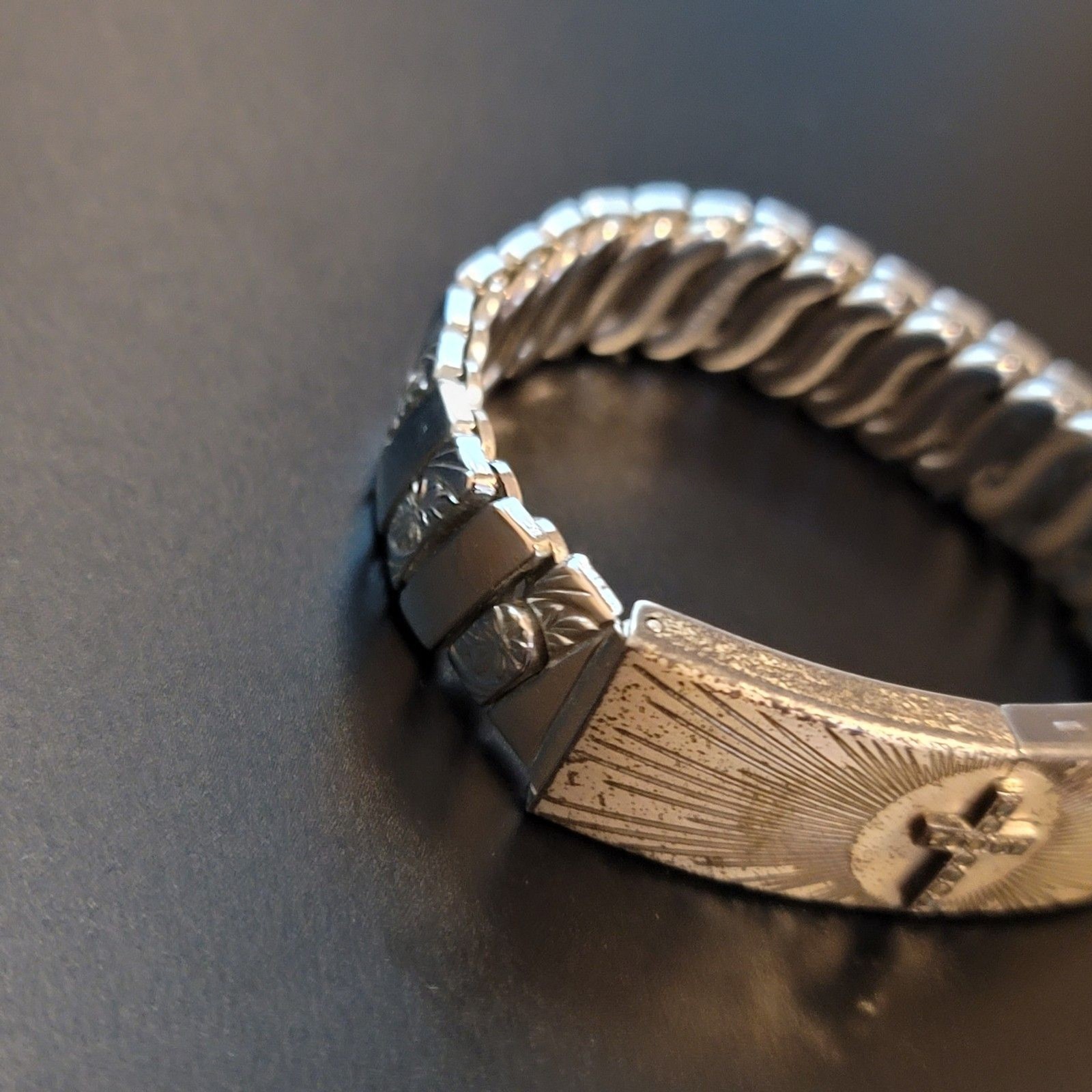 Design: Accordion/stretch bracelet with cross and sunburst etching