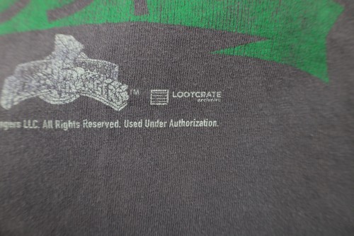 Blemishes shoulders, collar, inner collar. Right shoulder stretched. Dark spots, pilling. Collar, front, back sun faded. Graphics, color faded. Collar, arms discolored