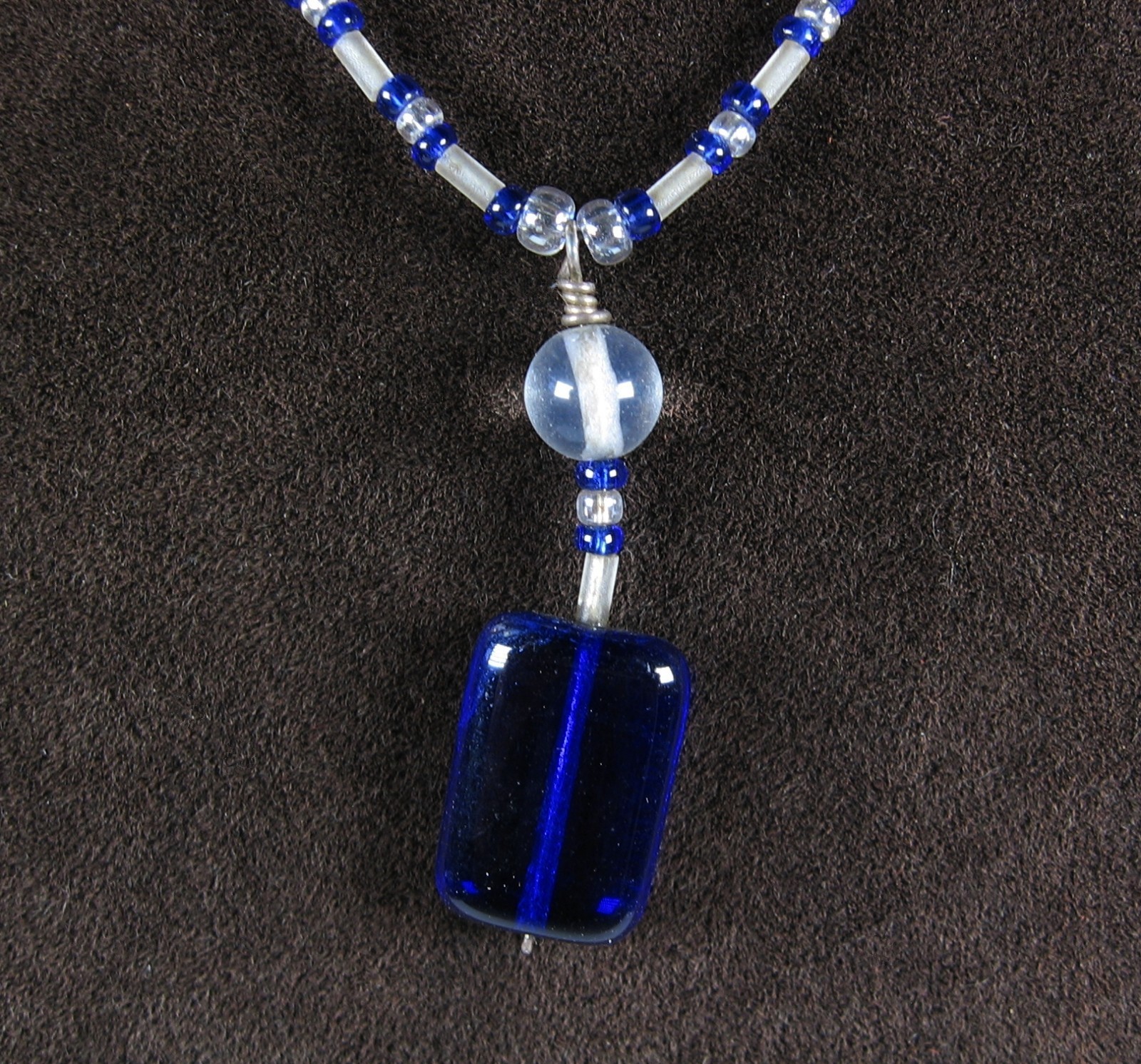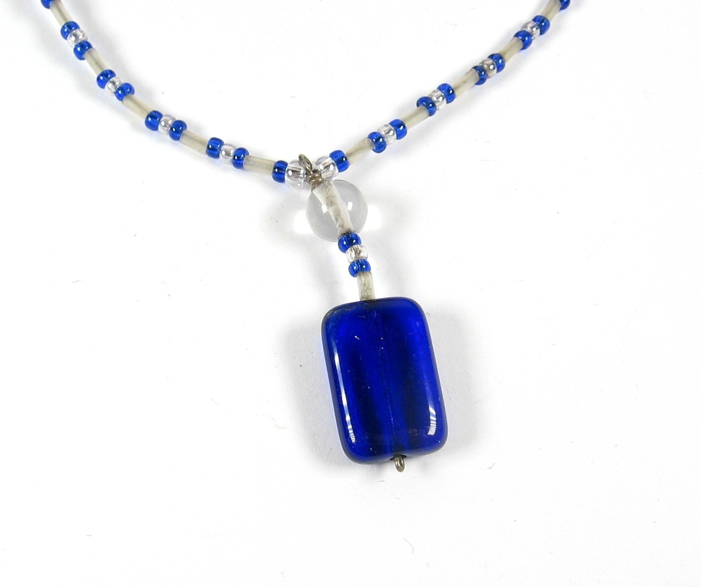 COBALT BLUE GLASS PENDANT Vintage Necklace Clear Seed Beads Retro Choker 16"