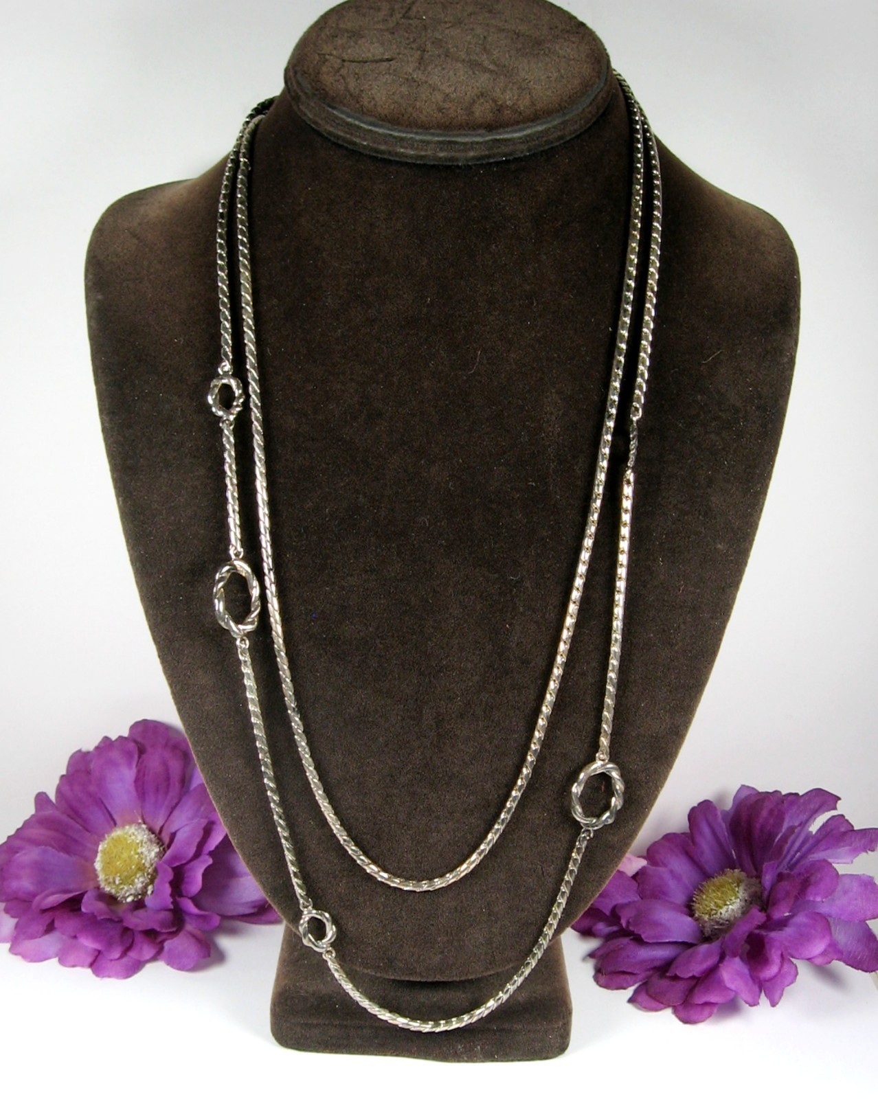 Monet OVAL CHAIN KNOTS Double Strand Vintage NECKLACE Silvertone 26 - 28" Long