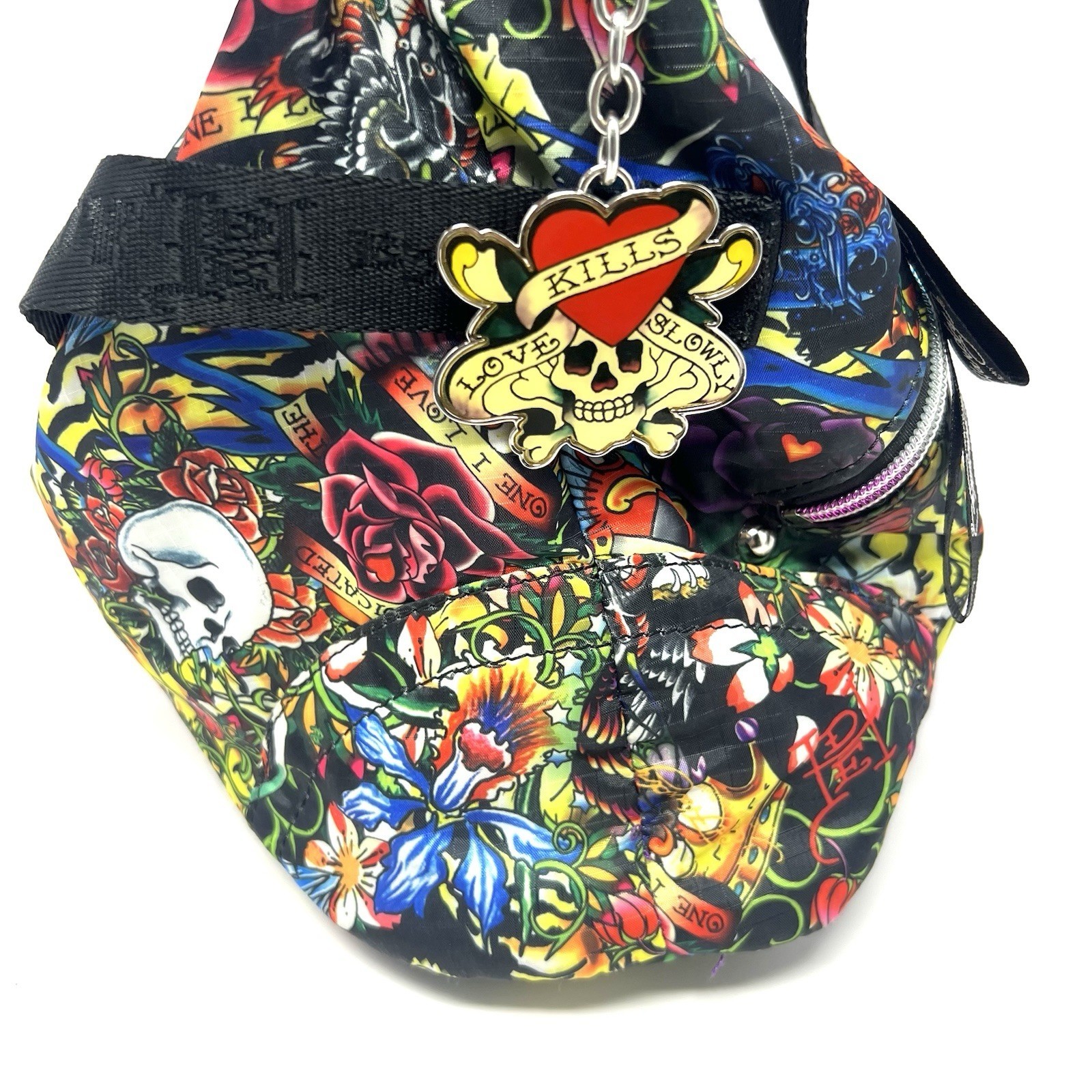 VTG Ed Hardy Womens Shoulder Bag Tattoo Skull Roses Butterfly & Love Kills Charm