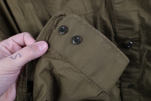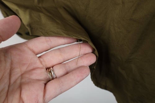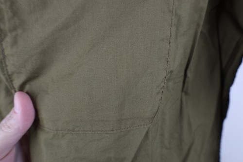 Blemishes on collar, pockets. Dark spots. Collar, cuffs discolored. Color faded. Loose threads bottom hem