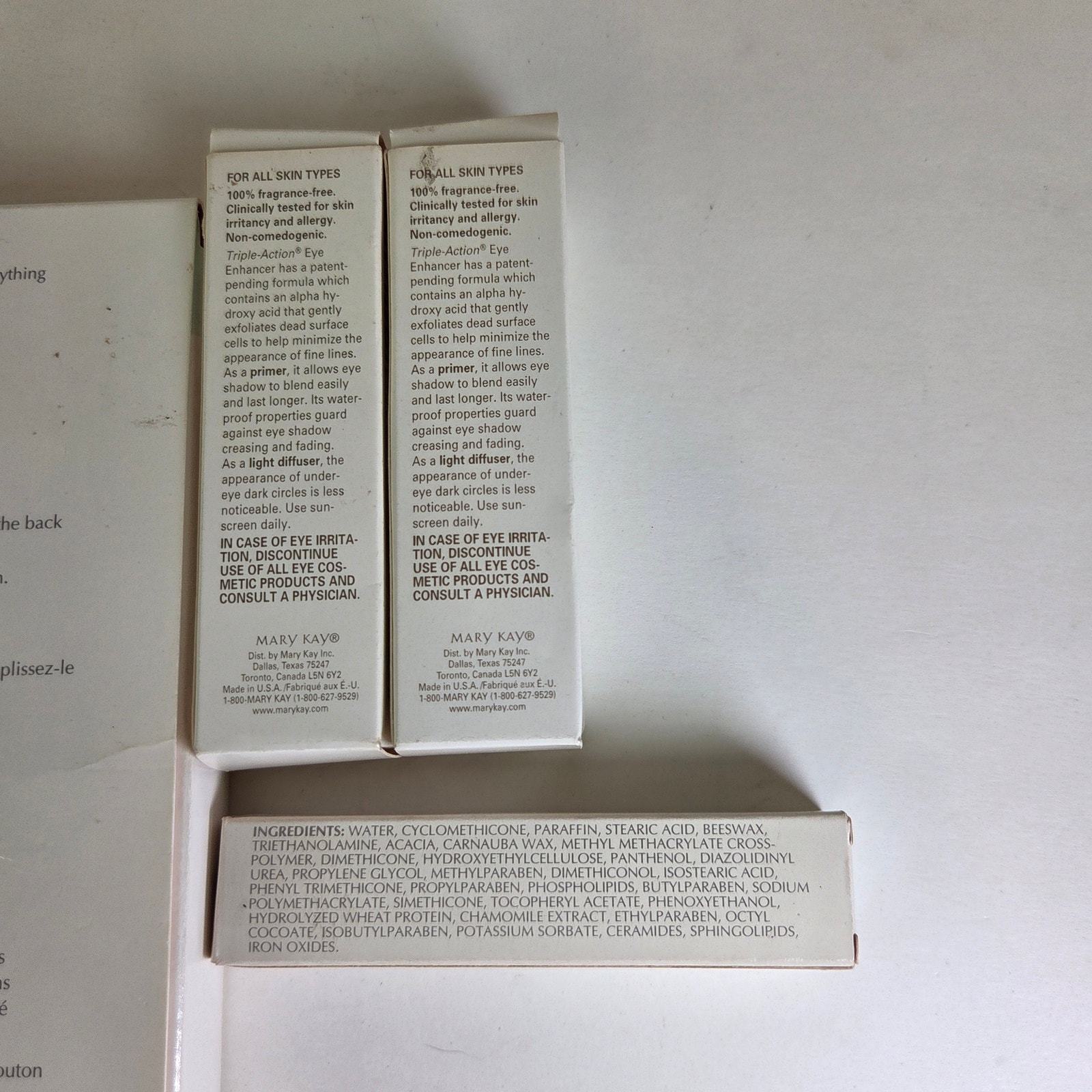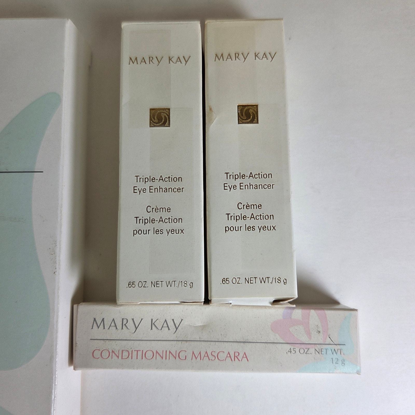 Lot of vintage Mary Kay cosmetics including a Color Palette compact (empty, never used), two boxes of Triple-Action Eye Enhancer Cream, and one Conditioning Mascara. All appear unused but due to age, items are sold as collectibles only and may not be suitable for application. Perfect for collectors, vintage beauty display, or nostalgic Mary Kay enthusiasts.