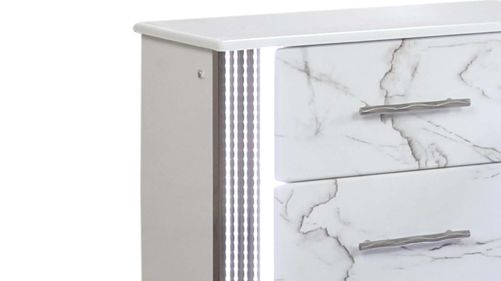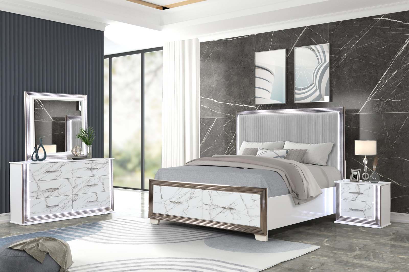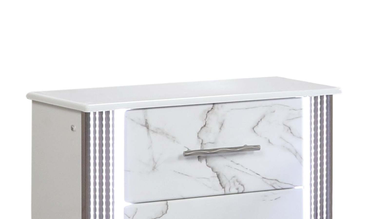 This modern nightstand is designed to bring style and functionality to any bedroom setting. It features a clean white finish, perfectly complemented by marble-inspired drawer fronts that add a touch of luxury. The two spacious drawers provide convenient storage for bedside essentials, keeping your space tidy and organized. Framed with polished metallic trim, the nightstand also includes integrated LED lighting along the sides, creating a soft, ambient glow that enhances the bedroom's atmosphere. Built from a blend of solid and manufactured wood, this nightstand ensures both