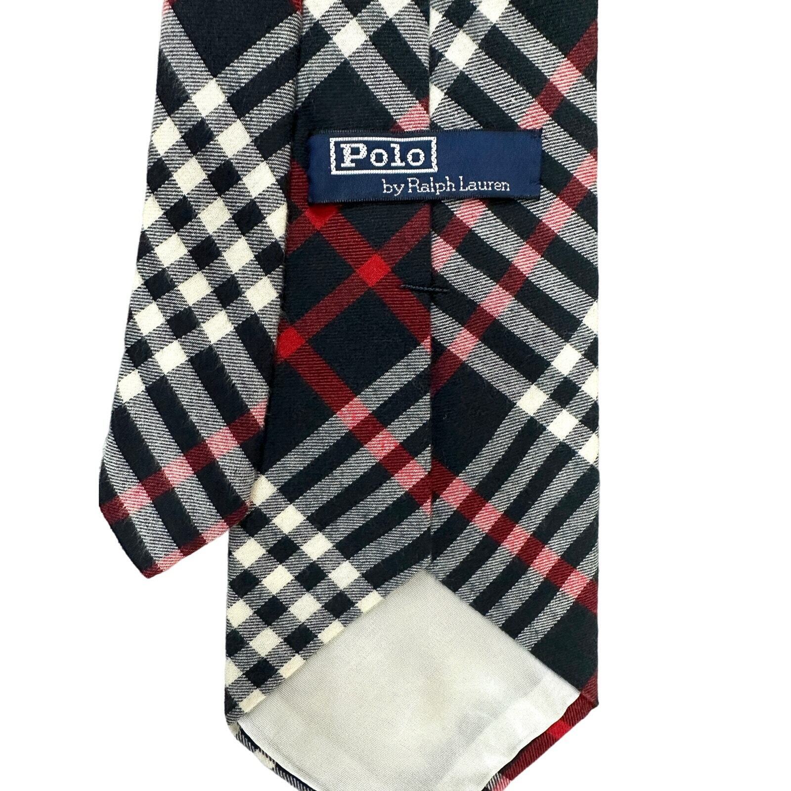 Polo Ralph Lauren Mens 100% Cotton Black, Red, Gray, Ivory Plaid with RED PONY Necktie MADE IN USA. 4.5" wide. Excellent condition, no flaws.