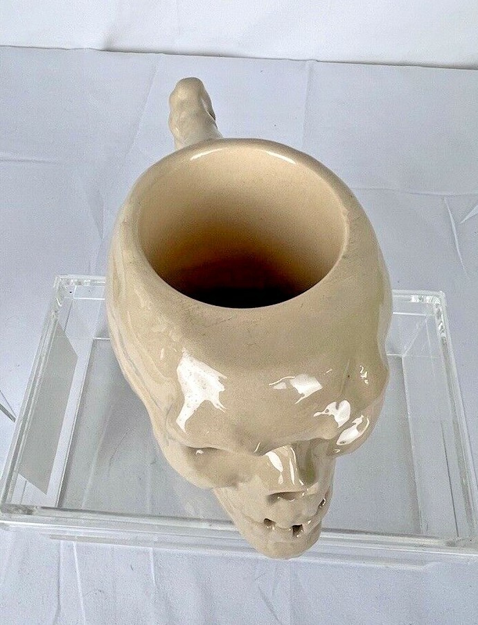 Vintage Unmarked Beige Ceramic Tiki Style Skull Mug Is Possibly Tepco Pottery. It's the classic long chin style Tepco made for them first even if it's lost it's Especially Made for Trader Vic's Mark on the bottom. Yes, it is heavy and solid weighing in at a smidge over 2 pounds. Yes, there's a hollow place for dry ice back by the handle. The mug inside diameter measures about 2.75" by 3.75" deep. It is about 5" tall. In terrific condition. See photos.