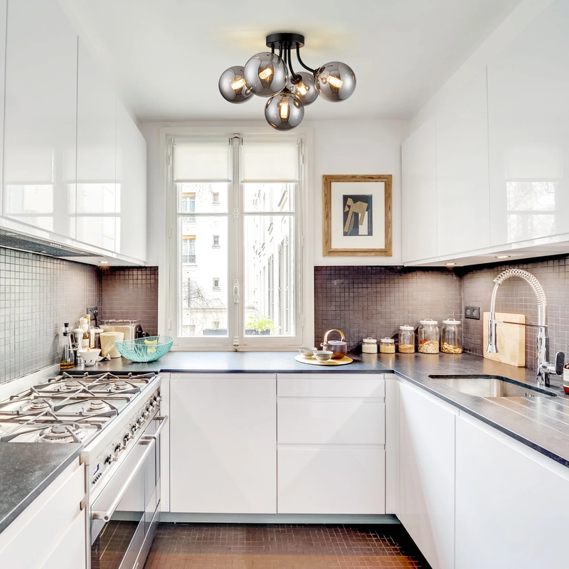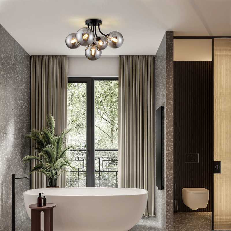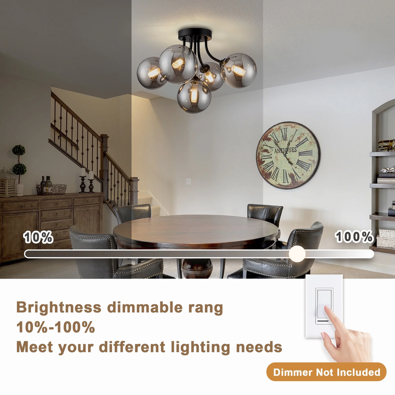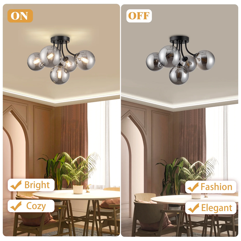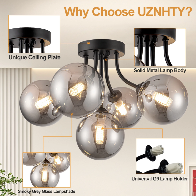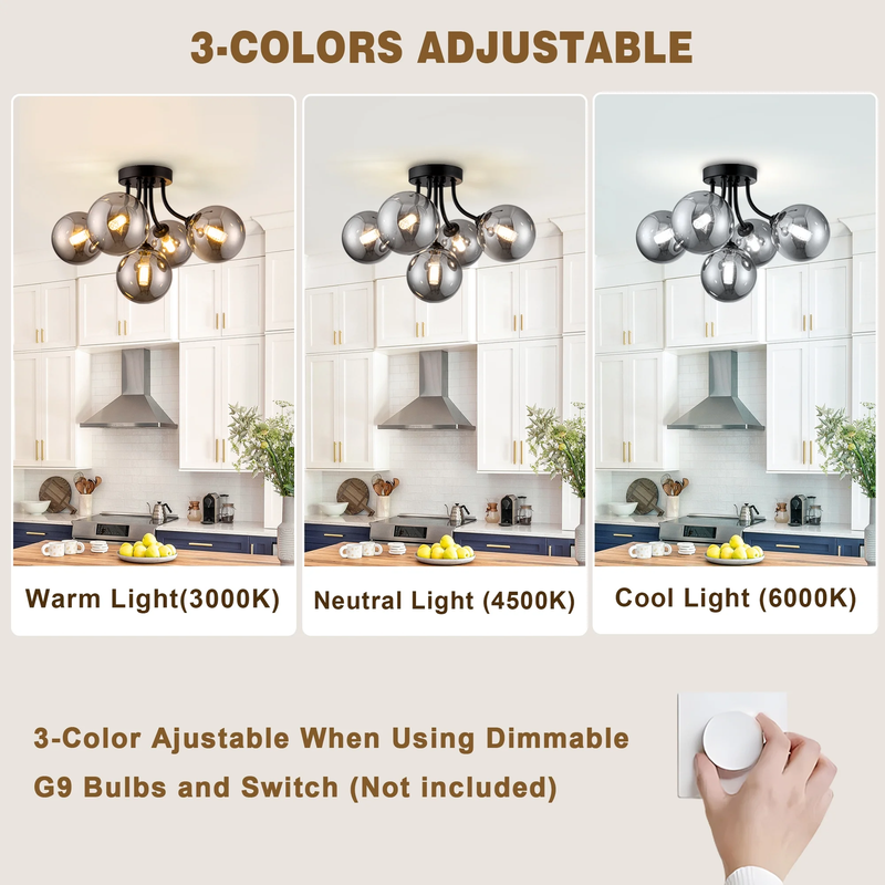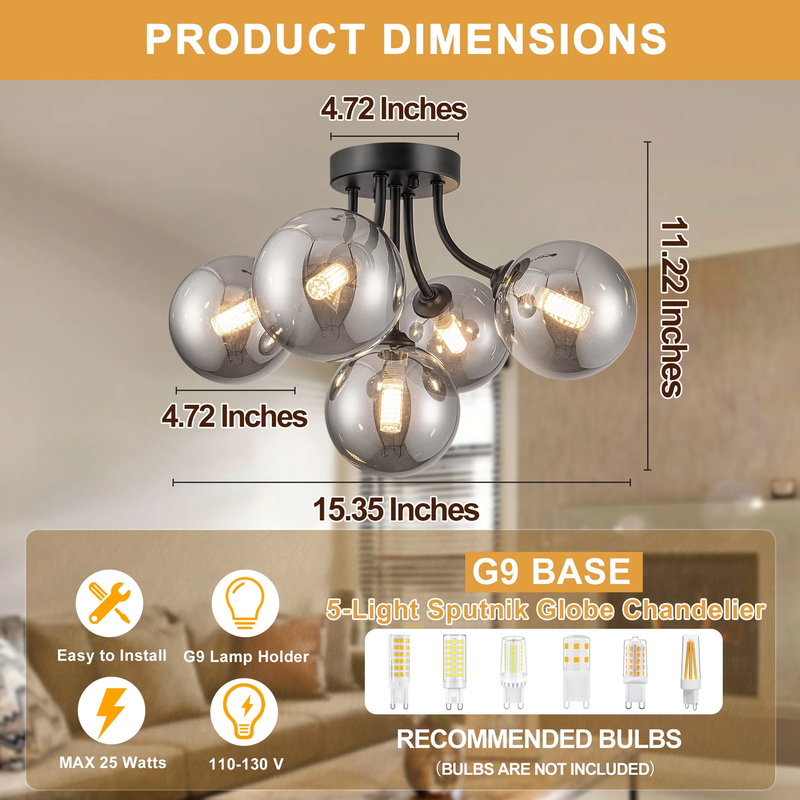Semi Flush Mount Ceiling Light: Sputnik light fixture is built with premium black metal that resists rust and discoloration. The hand-blown smoke-gray glass globes scratch-resistant finish means it stay looking brand new for years, and the heat-resistant design keeps things safe by preventing bulb overheating. 10-Minute Easy install: Designed for hassle-free setup and fits most ceiling types. The included hardware and clear instructions ensure even DIY novices can install it in 30 minutes. 3-Color Temperature Dimmable Function: This kitchen lighting fixtures ceiling allows G9 bulbs with different color temperature and compatible dimmers to creating the perfect atmosphere for dining, relaxation, or entertaining.(bulb and switch not included) Bulb Requirements: The bathroom ceiling light come with 5 G9 standard bases. The bulbs type: G9, max 25W (bulbs not included). You can choose different types of mid century modern light fixture bulbs to create the desired lighting effect.