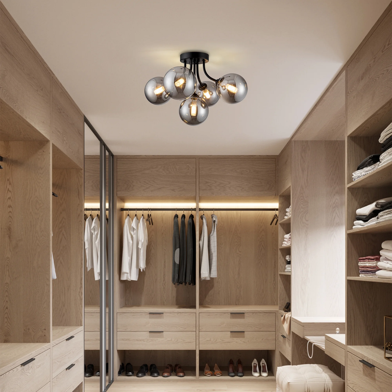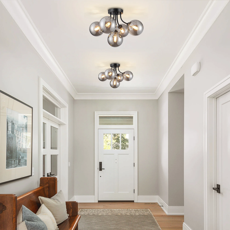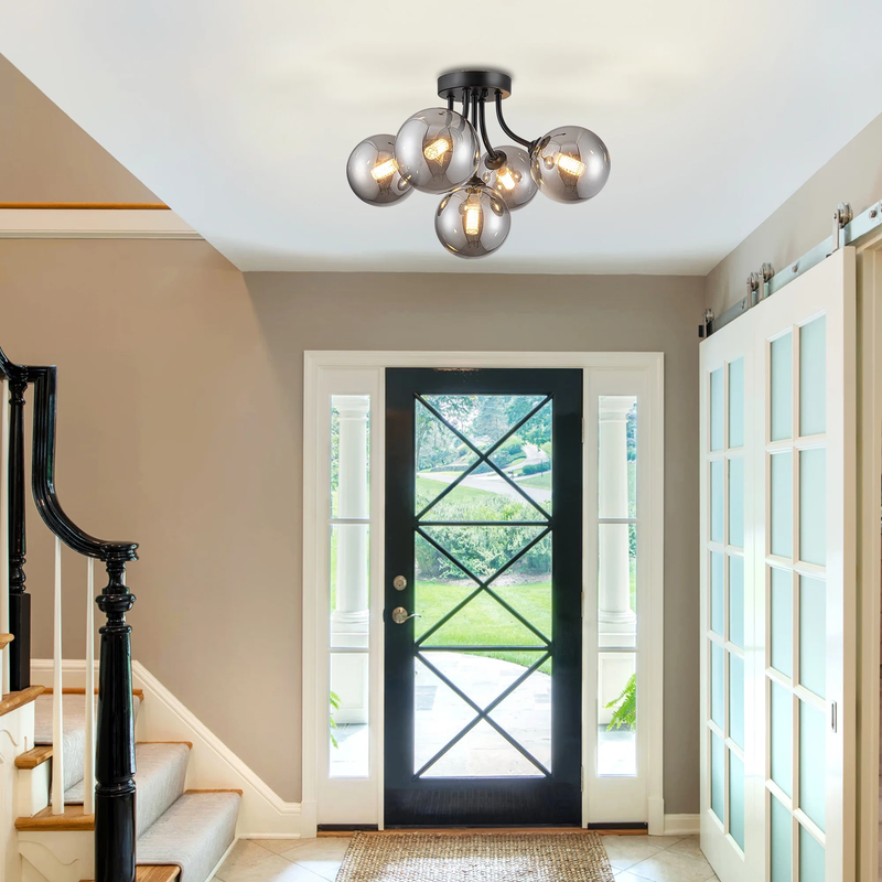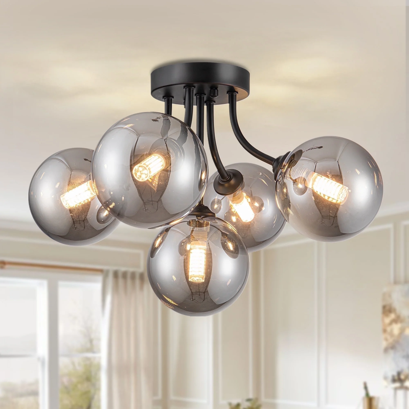 This semi flush mount ceiling light fixture has a cool solid metal lamp body and 5 smoky gray glass globes. Its like a perfect blend of old-school charm and modern clean lines. The semi-flush mount design means it hugs the ceiling just right, perfect for lower ceilings. The curved metal arms give it a smooth, flowing look that really dresses up a room.