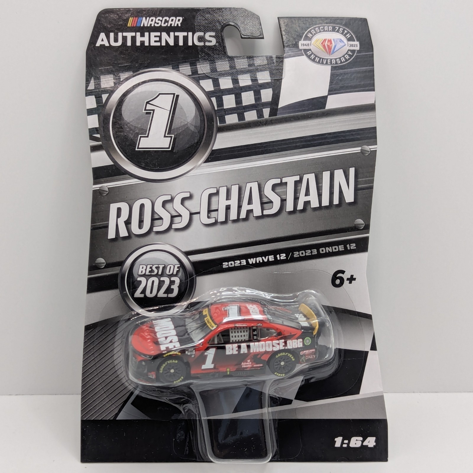 Official Lionel Racing NASCAR Authentics 1:64 diecast featuring Ross Chastainโs 2023 #1 Moose Chevrolet Camaro in the striking red and black Wave 12 release. A must-have for Trackhouse Racing fans and collectors of one of NASCARโs most exciting drivers.