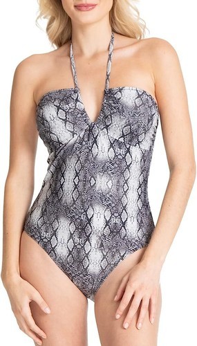 A trendy snake print updates a one-piece swimsuit crafted with a ruched halter-tie neck and removable soft cups.