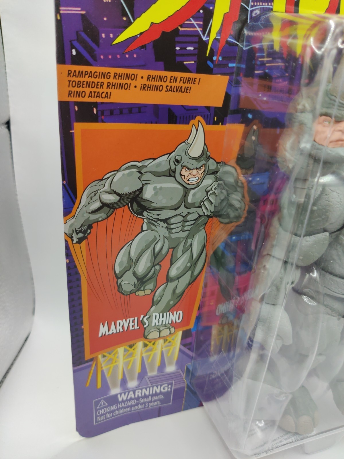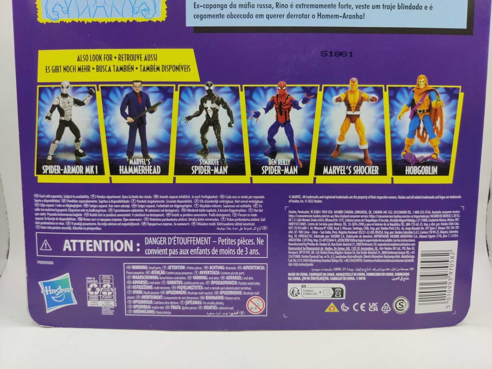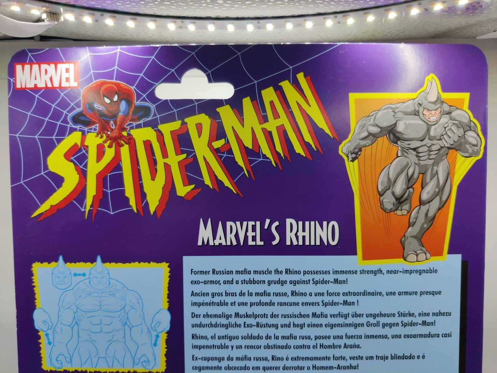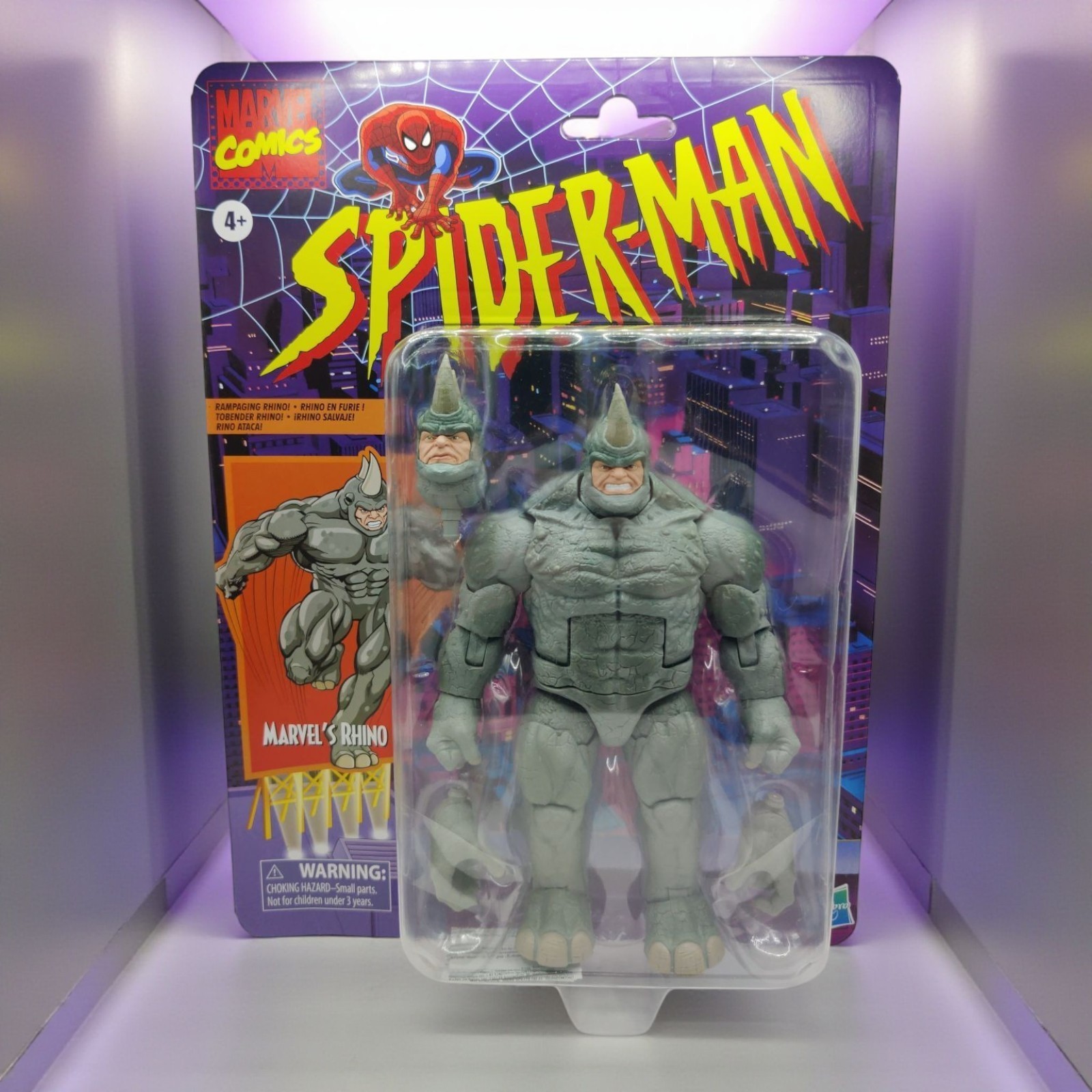 The product is a brand new sealed on card Marvel Legends Retro Spider-Man Animated Series Rhino action figure by Hasbro.