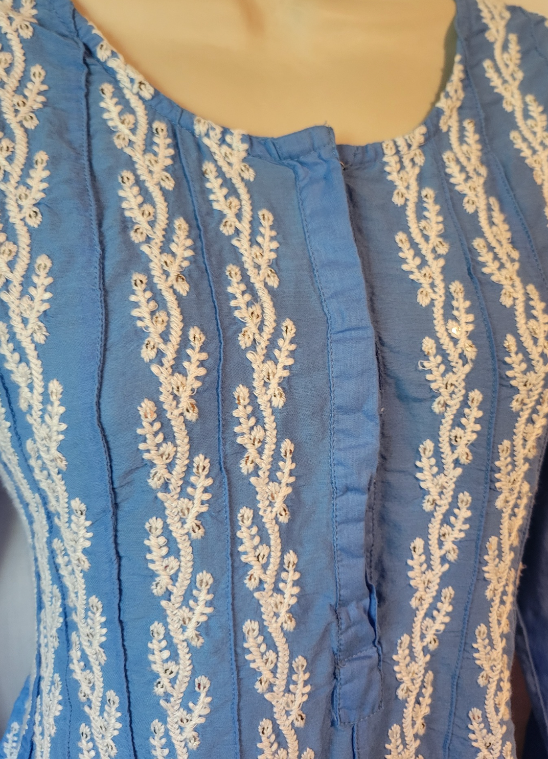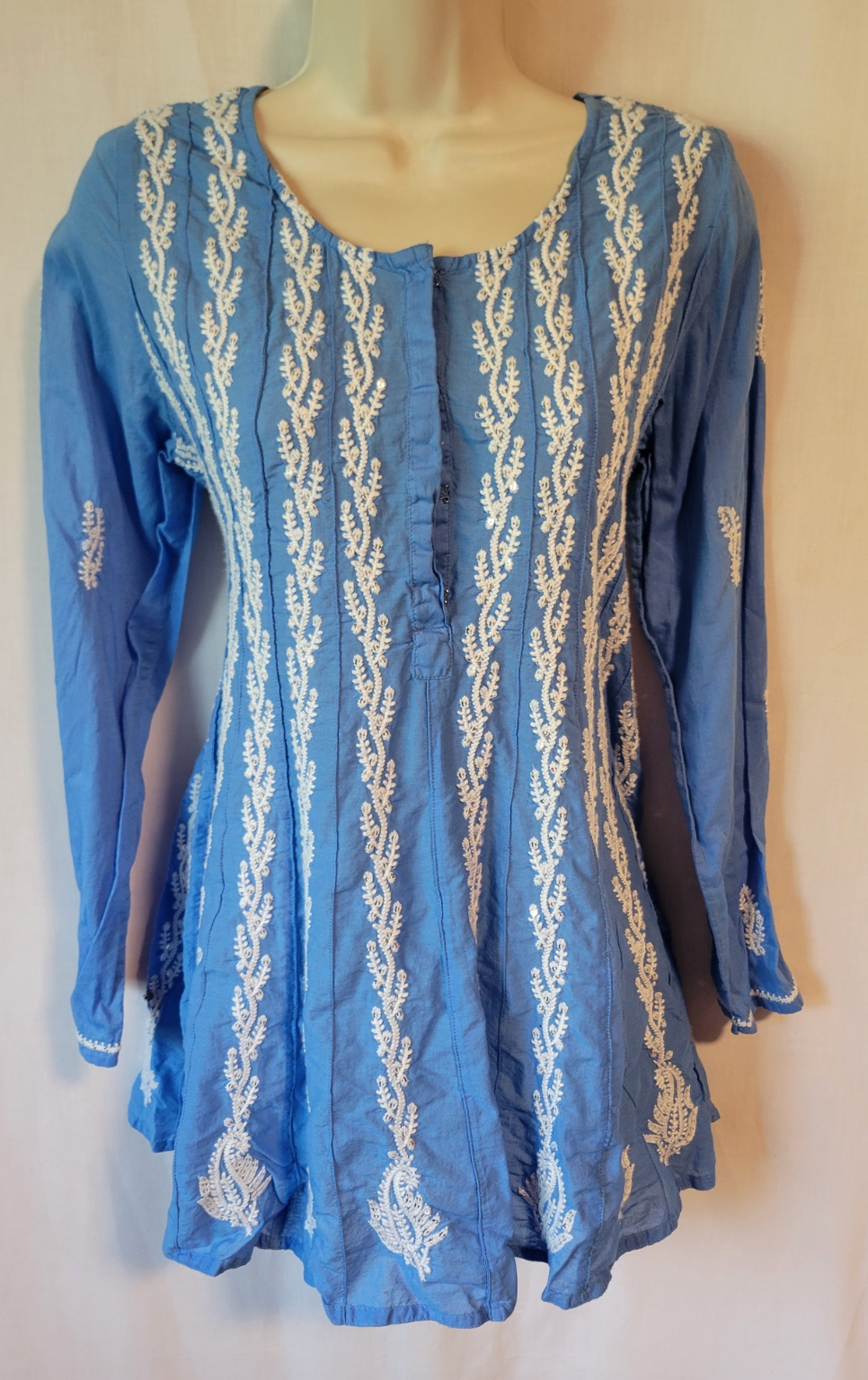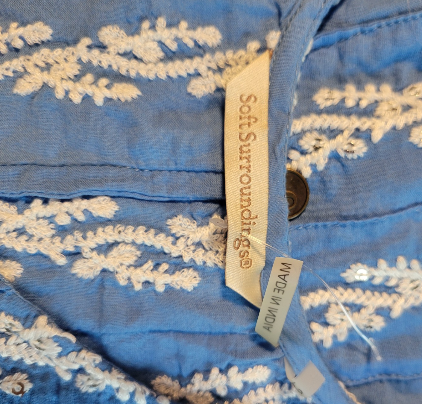 Soft Sourroundings PS blue top white embroidery sequins cotton