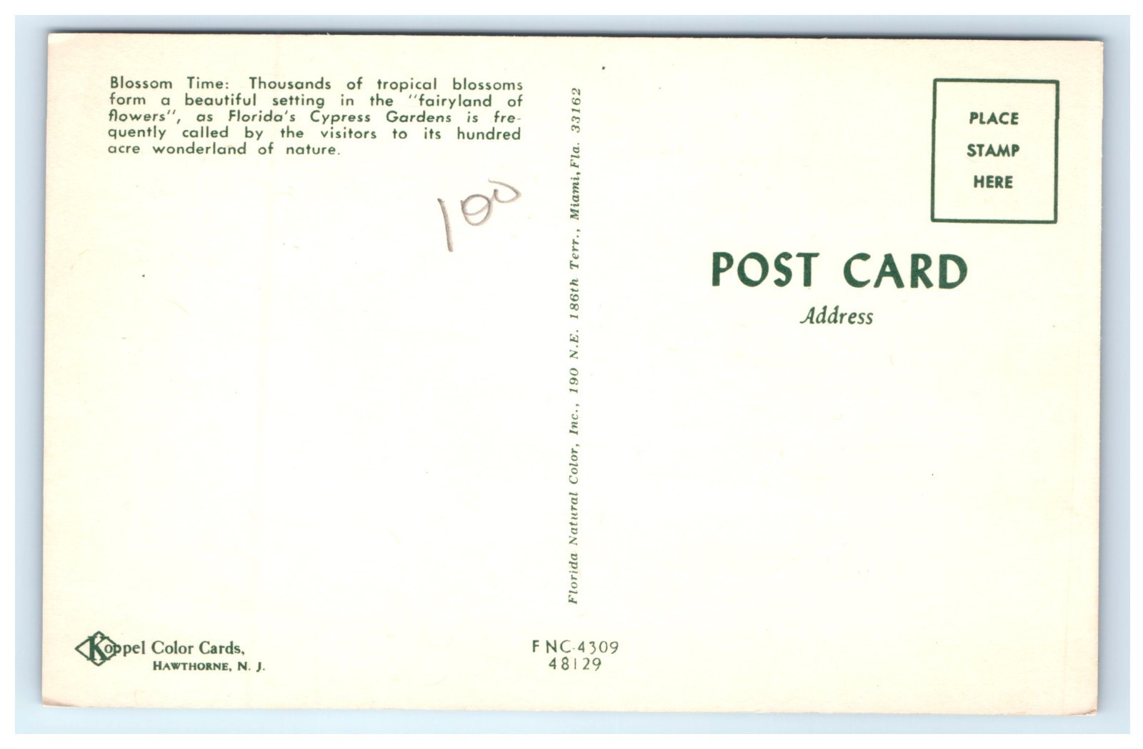 ? Back: Unused. Published by Florida Natural Color, Inc., Miami, Florida. Distributed by Koppel Color Cards, Hawthorne, N.J. Card number FNC-4309 / 48129.