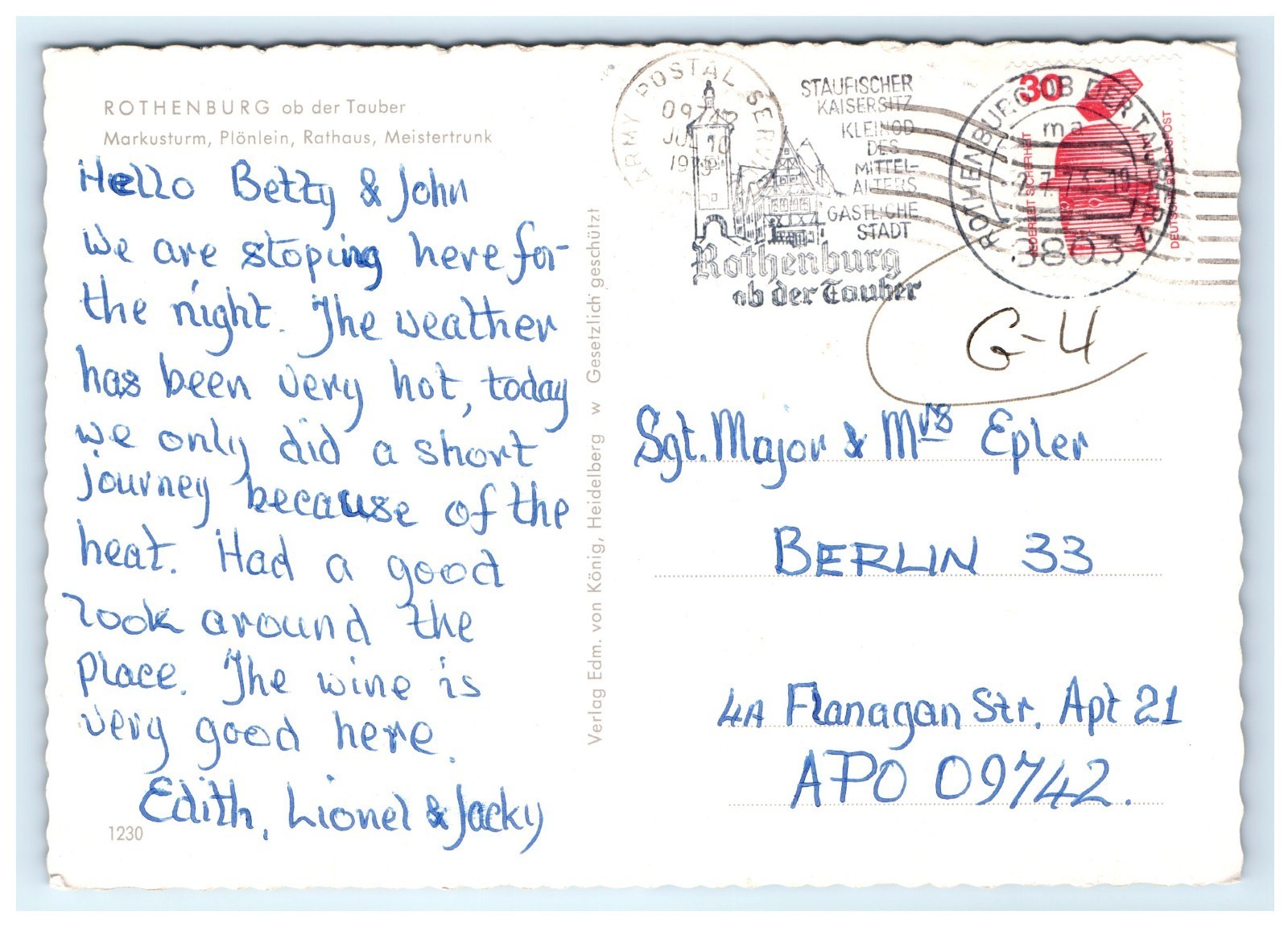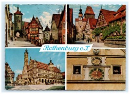 This vintage postcard presents a multi-view of Rothenburg ob der Tauber, Germany, one of the best-preserved medieval towns in Bavaria. The featured images highlight the famous Plonlein with its half-timbered houses, Markusturm gate, the impressive Rathaus (town hall), and the Meistertrunk clock with mechanical figures. The card is a classic collectible view of this world-renowned walled city.