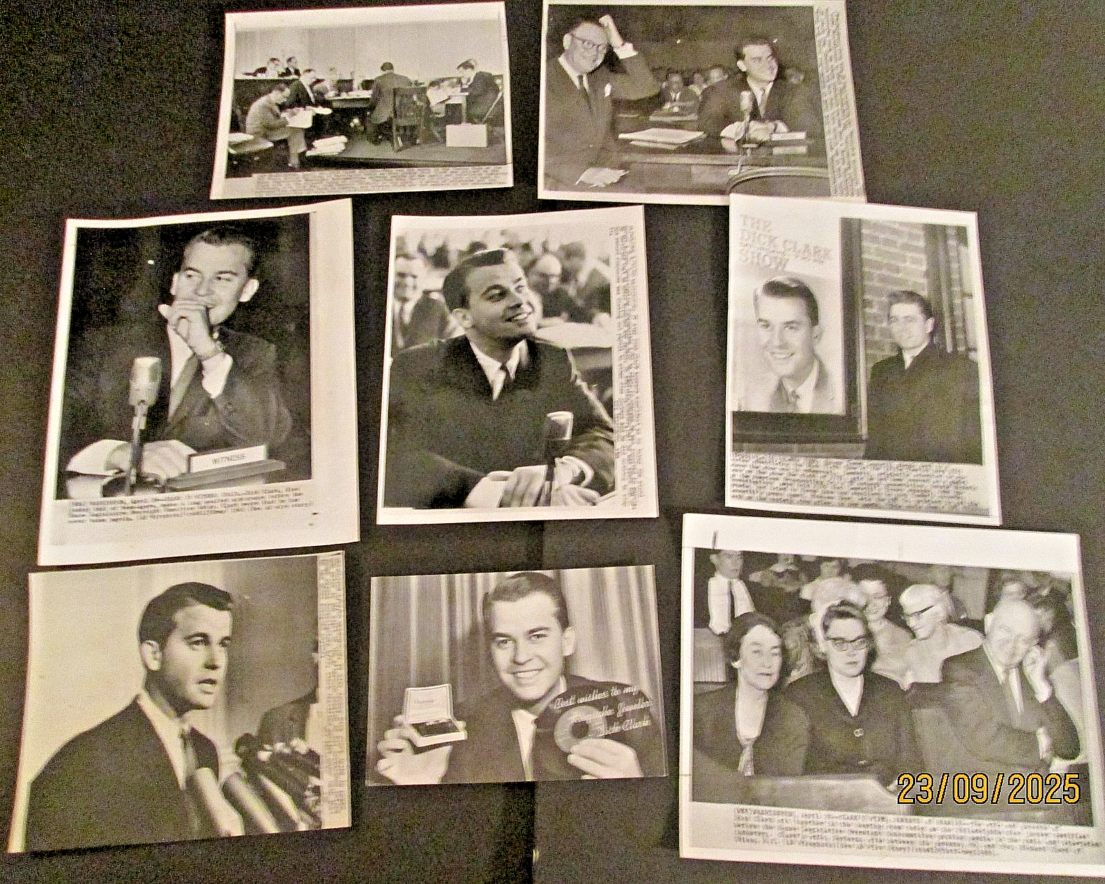 DICK CLARK: (AMERICAN BANDSTAND) PAYOLA SCANDAL : 1960,S VINTAGE COLLECTION) (MOST OF THESE VINTAGE PHOTOS ARE A MIX OF PRESS PHOTOS WITH SNIPES AND STAMPS ON BACK (ALSO VINTAGE BANDSTAND POSTCARD)