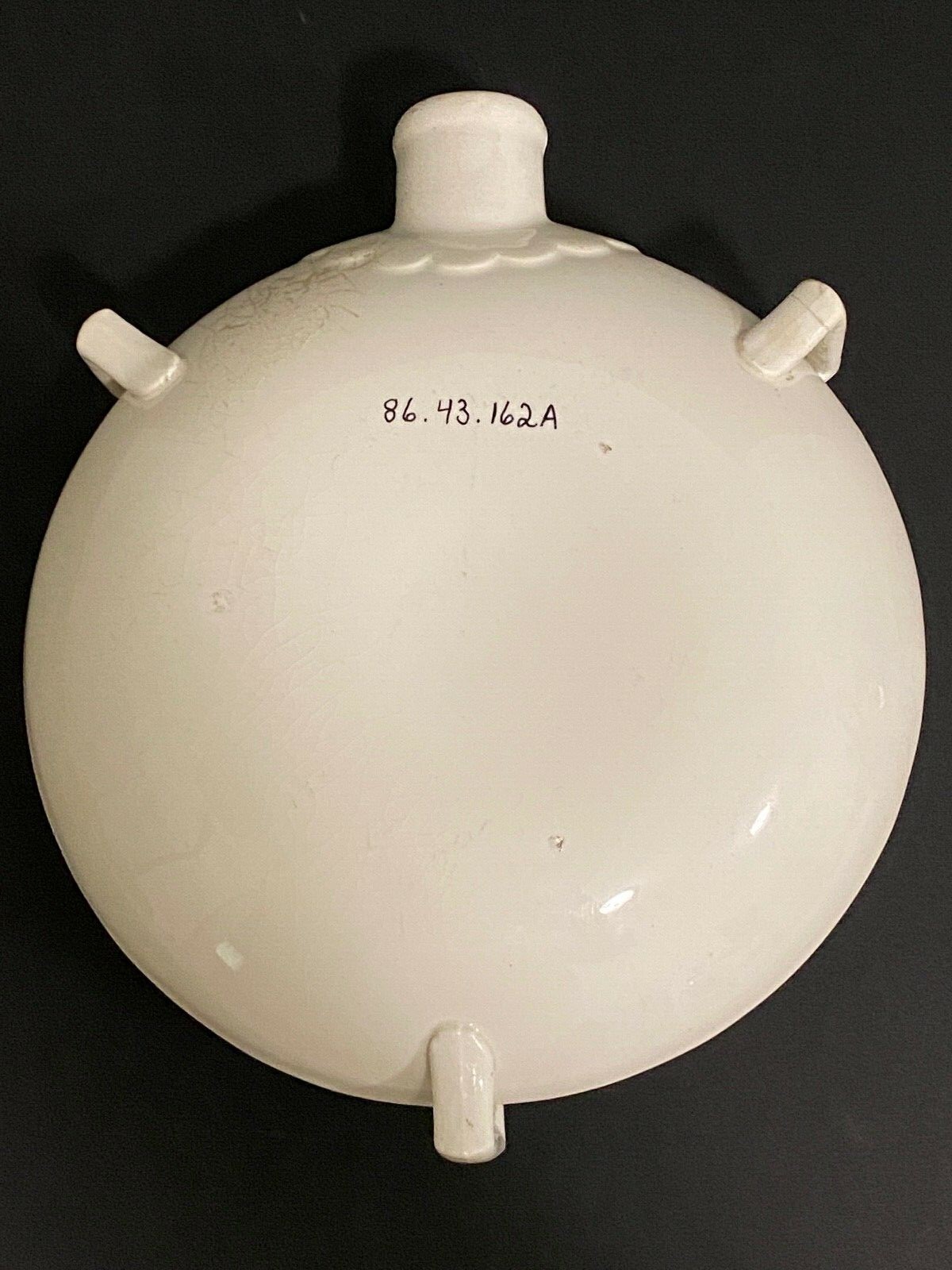 The back of this presentation canteen is marked 86.43.162A. This number represents the catalog number from the Gettysburg Civil War Library and Museum, Philadelphia, Pennsylvania, which has since closed its doors.