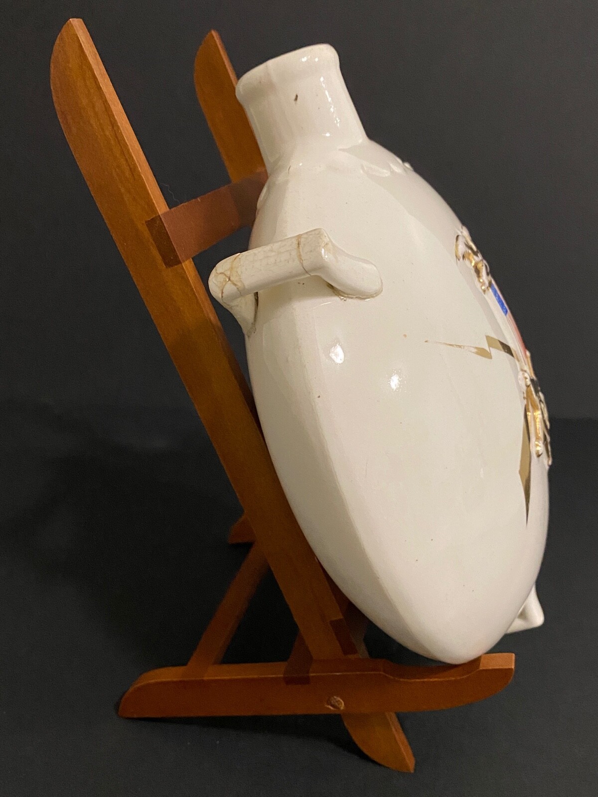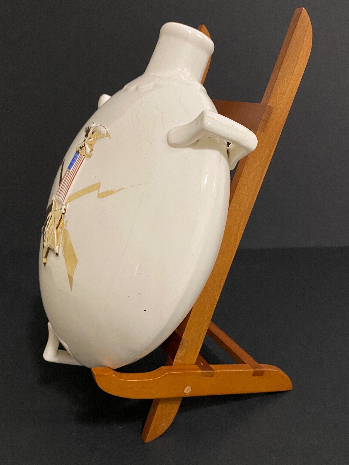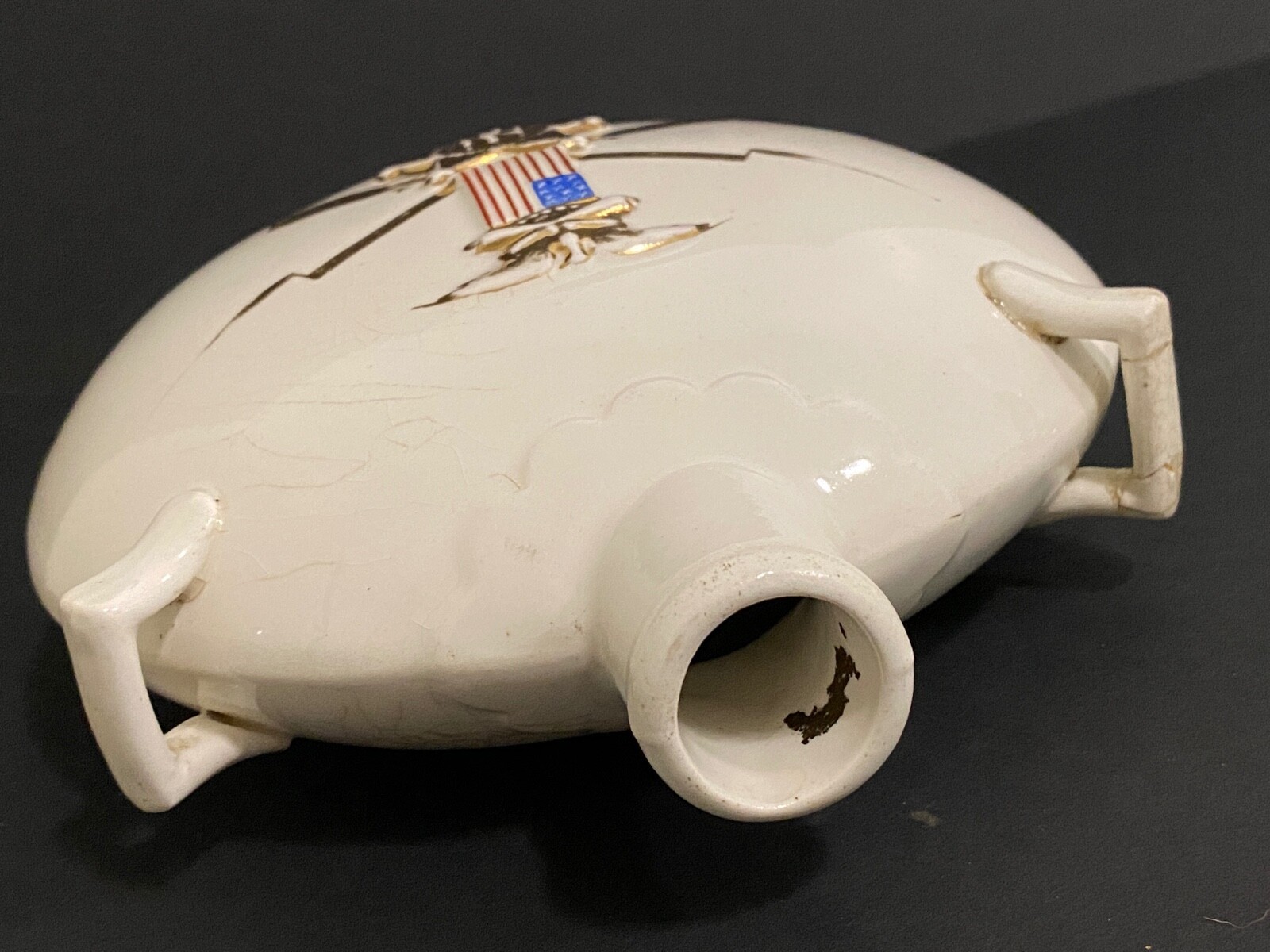 The white ceramic presentation decanter is shaped like a Civil War Canteen and decorated with hand painted gilt accents. Embossed and hand painted in the center of the canteen is the famous G.A.R. membership medal, featuring a gold gilt eagle grasping crossed cannons perched above a red, white and blue American flag. Below the flag is a large gold gilt star. Crossed Infantry weapons. The ceramic brackets or sling guides for a leather strap are all intact. It is in very good condition other than some crazing, discoloration and worn gold gilt, all expected considering the age. This round decanter is meant to be hung. It is about 8? in diameter without the neck. Including the neck its 9 oe? high and 10 oe? high.