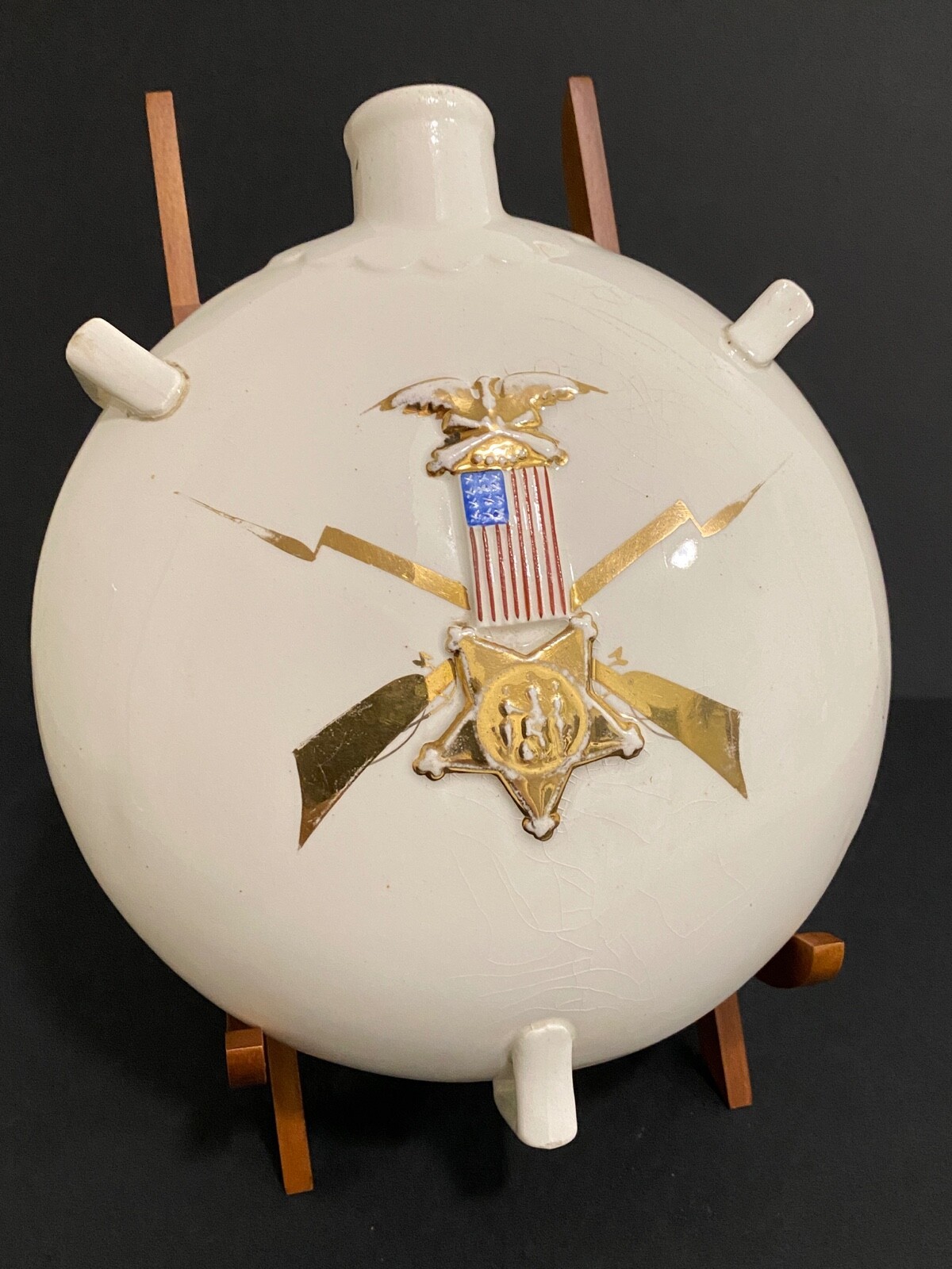 In the years following the American Civil War, veterans' organization such as the Grand Army of the Republic and the Union Veterans Union created iconic souvenir and presentation pieces modeled after the M1858 regulation canteen. Emphasizing their "fellowship in battle" these pieces usually bore the inscription "We drank from the same canteen." These pieces were of various sizes and differing materials ranging from inexpensive pot metal to stoneware and, in rare circumstances, porcelain. The piece shown here is of the highest quality. Made of fired porcelain, it is highly decorated with both hand painted designs and extensive gilding. While the surface glaze shows microscopic crazing, as expected in a piece of this age, the paint and gilt decoration is fresh, bright and at 85% of its original condition. In design, decoration, rarity and historical significance, this presentation canteen, in our opinion, is a fine example of its kind.