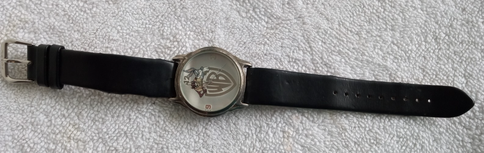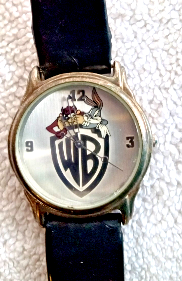 This 1996 released Bugs Bunny watch features Bugs and Taz atop a large silver tone WB Warner Bros. logo. Case diameter 34 mm mineral crystal, Smooth black 18mm leather band. Fits up to a 8 1/2 inch wrist
