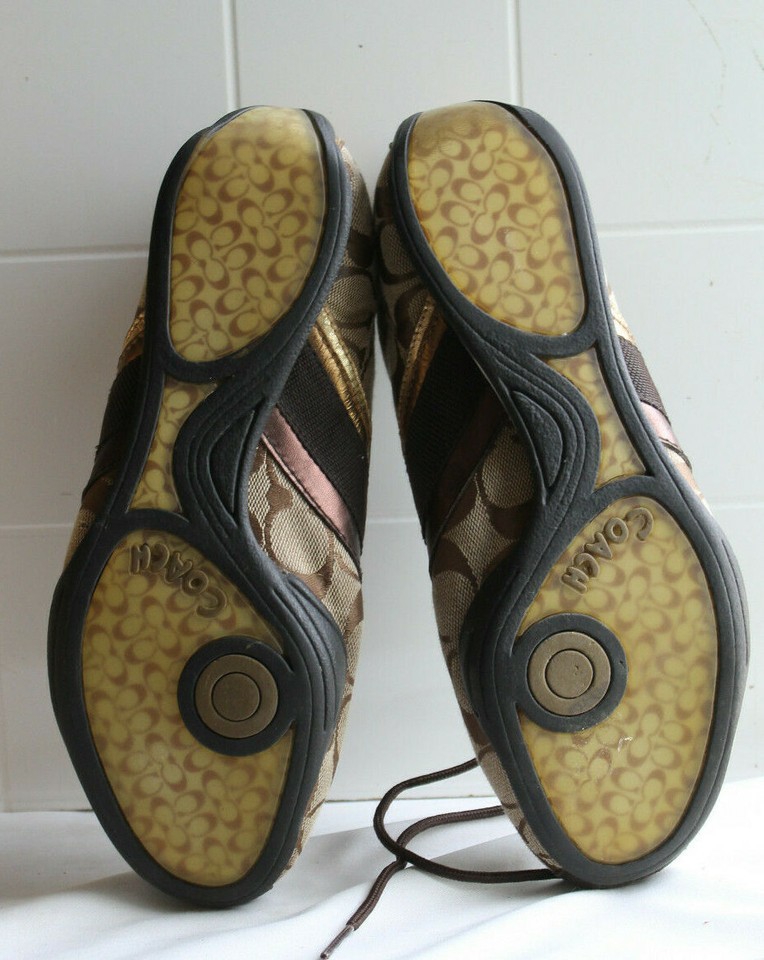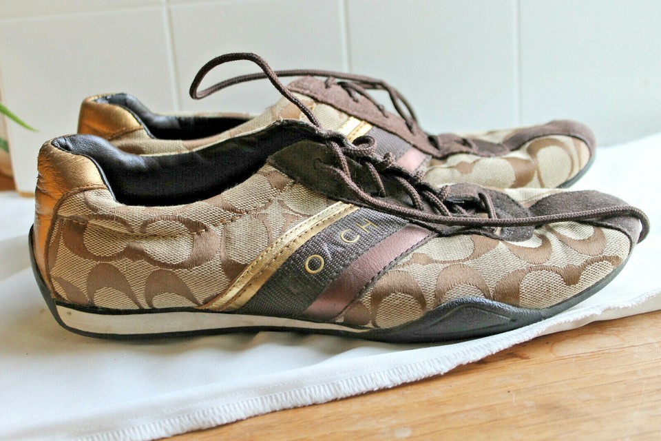 Coach Women’s Jayme Khaki Gold Signature Canvas Suede Brown Monogram Shoes SZ 8M