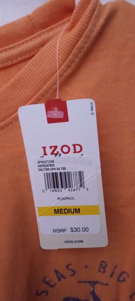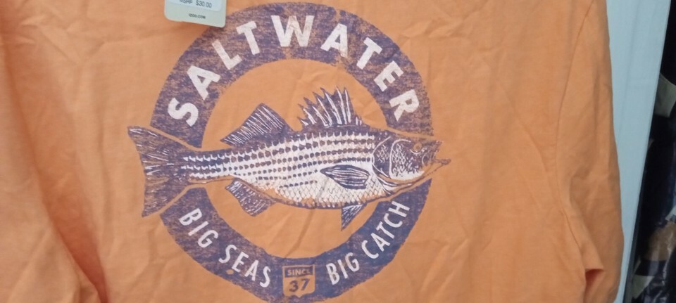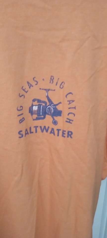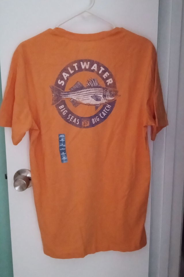 New with tags Izod Saltwater shirt. It?s orange with small ?big seas big catch? design is on front larger fish design on back. Size Medium