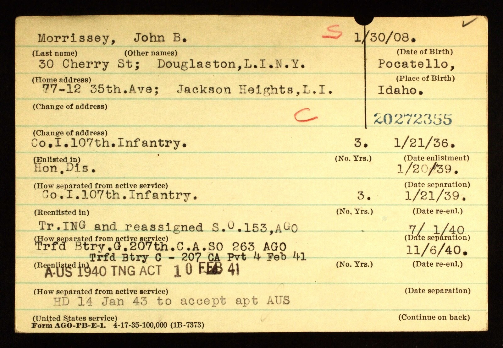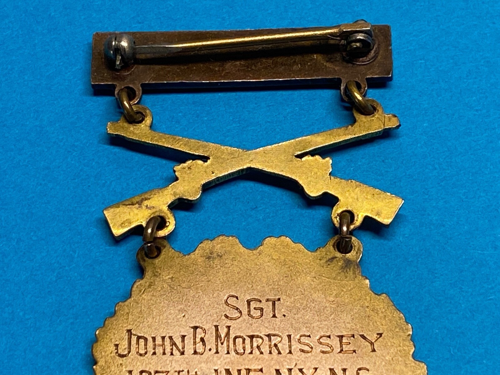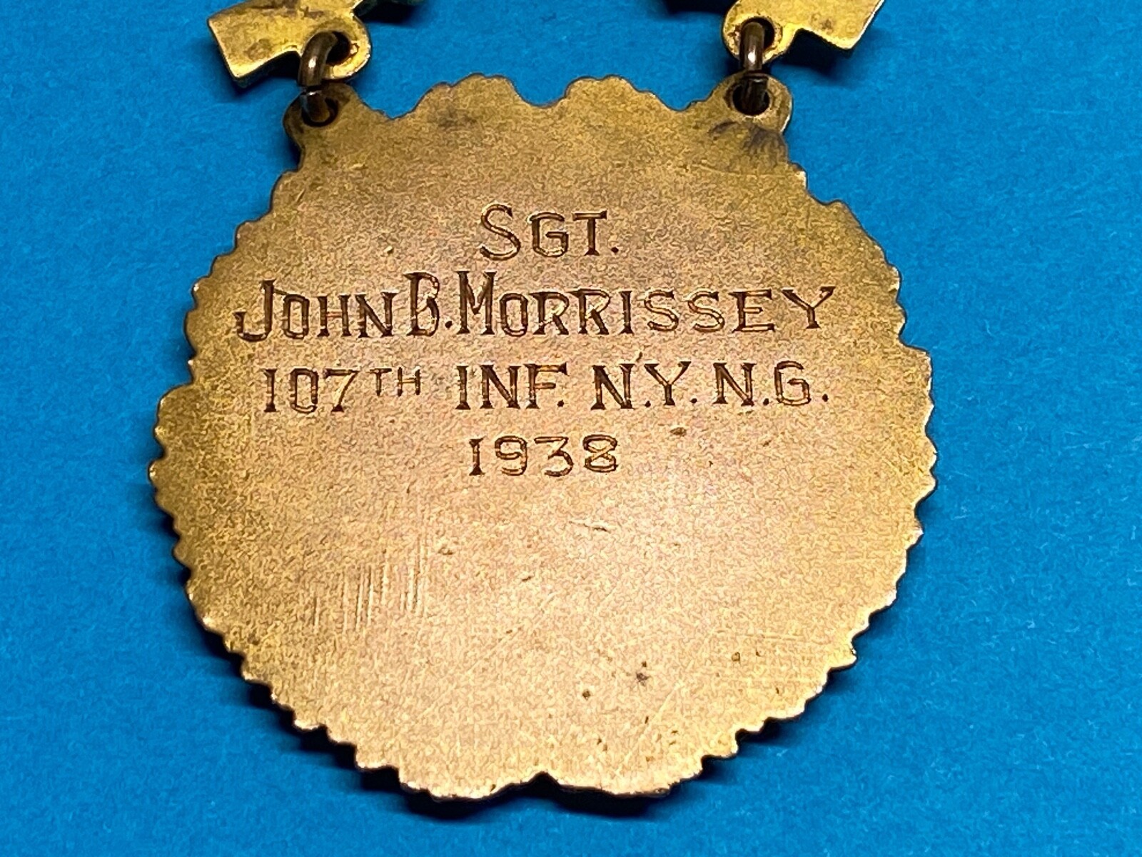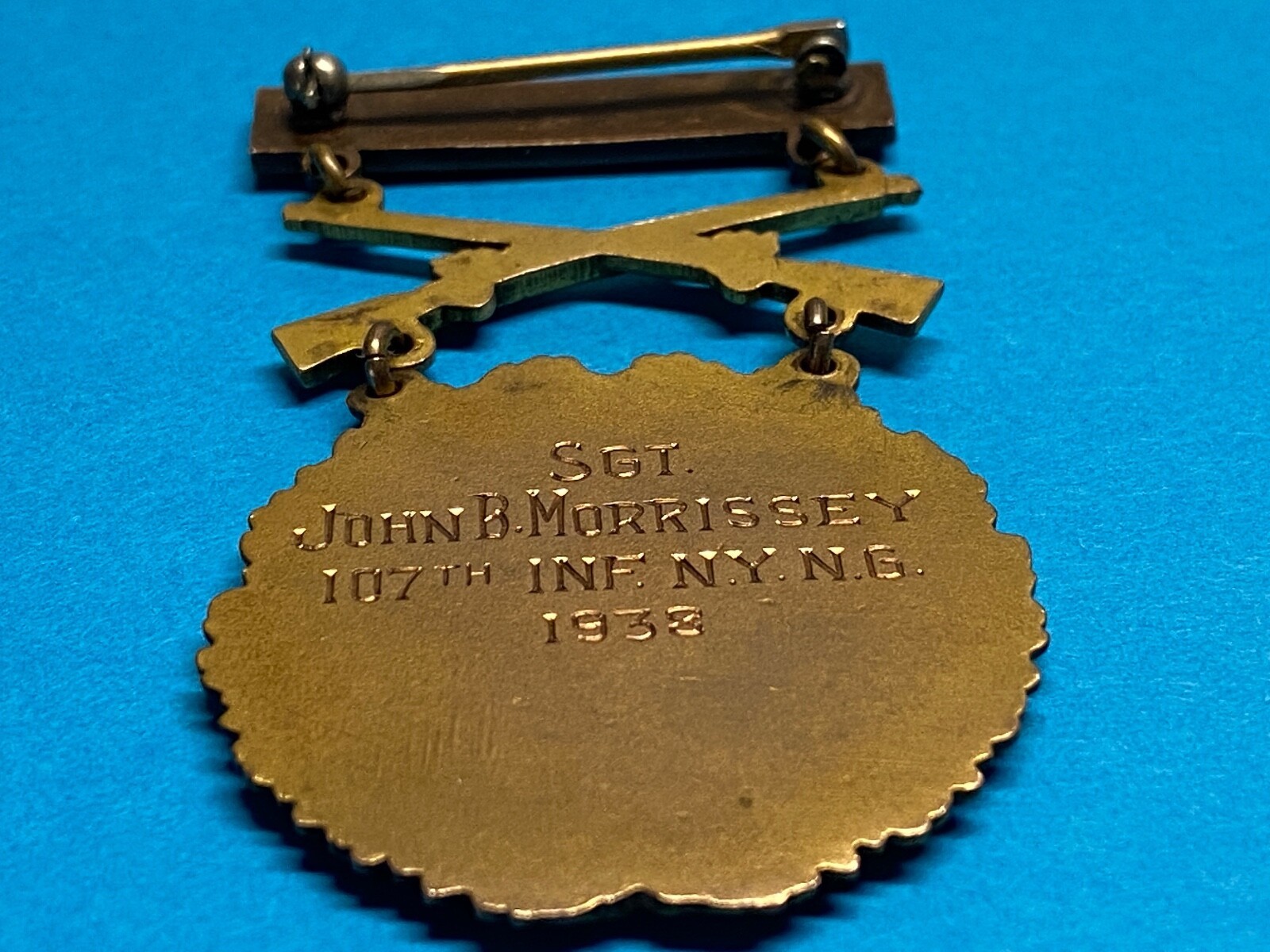 This 1938 Infantry Army Level Prize for Rifle Competition was awarded to SGT John B. Morrissey, Company I, 107th Infantry. SGT Morrissey was born on 30 January, 1908, Pocatello, Idaho. SGT Morrissey enlisted on 21 January 1936. When John Bacon Morrissey was born on January 30, 1908, in Pocatello, Idaho, his father, Harry, was 30 and his mother, Florence, was 23. He had two sons and two daughters with Anna R Morrissey. He died on February 3, 1982, in Aberdeen, Maryland, at the age of 74.