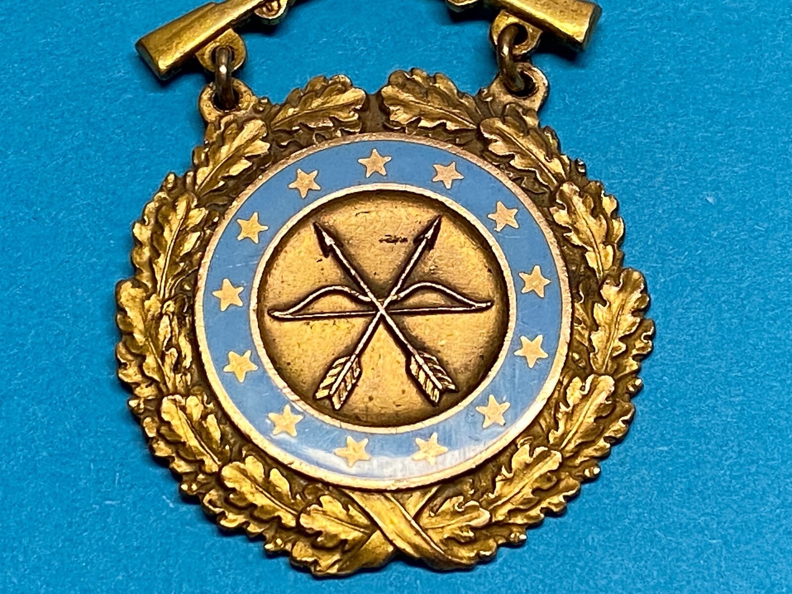 3. The third , lower piece is a planchet, that when enameled, told the arm or the type of service, in this case, blue for Infantry. The central design is a bow and a pair of arrows. The planchet consists of three concentric designs. The inner circle, .0625? in diameter, displays a compound bow and two crossed arrows, a symbol of marksmanship. Outside of that is a center ring, 015? in width, which displays 13 stars. An oak-leaf wreath executed in bronze surrounds the entire design, making the planchet 1-1/2? in width. The combatant arms had bronze stars with the ring enameled in blue for Infantry.