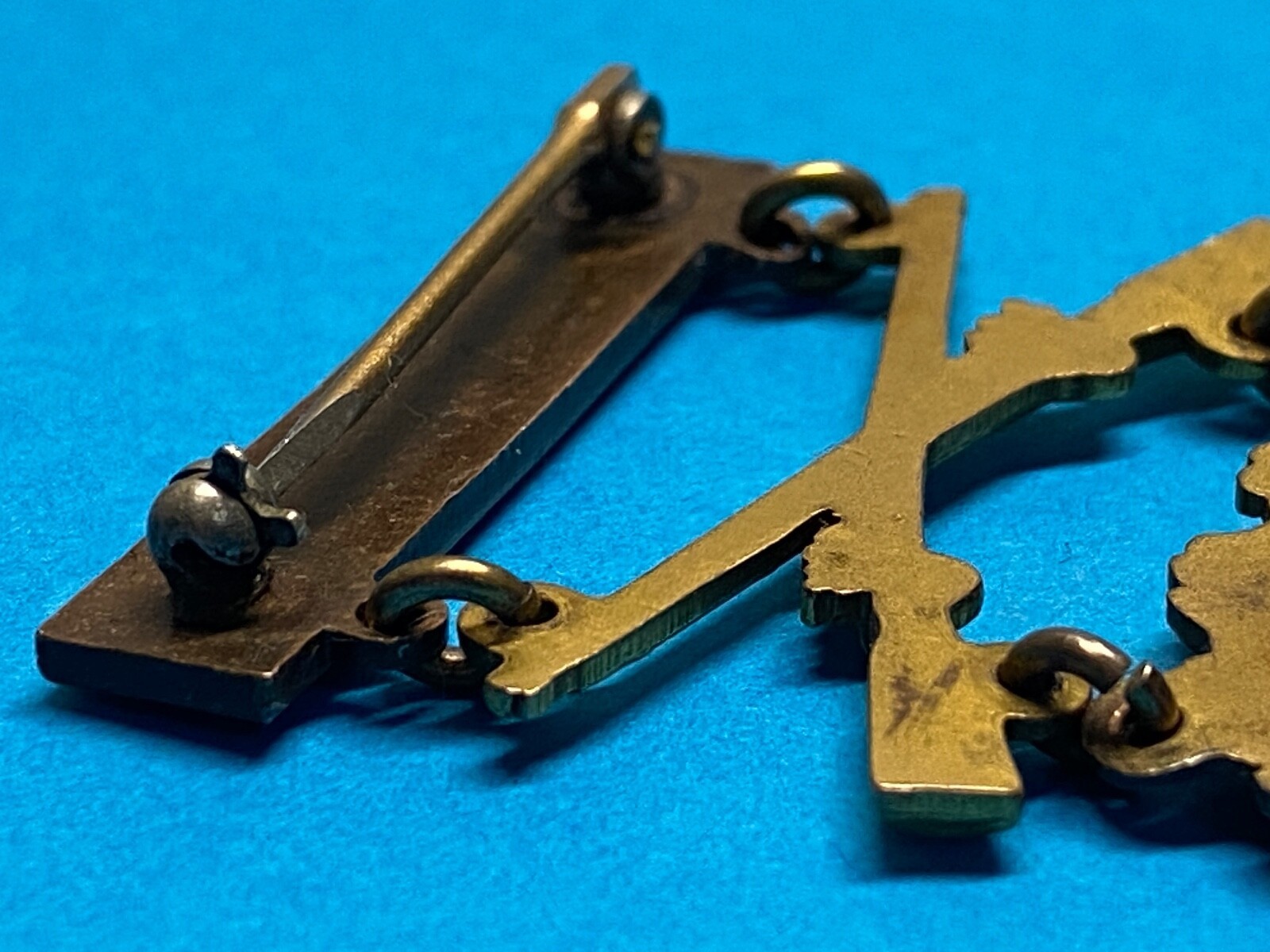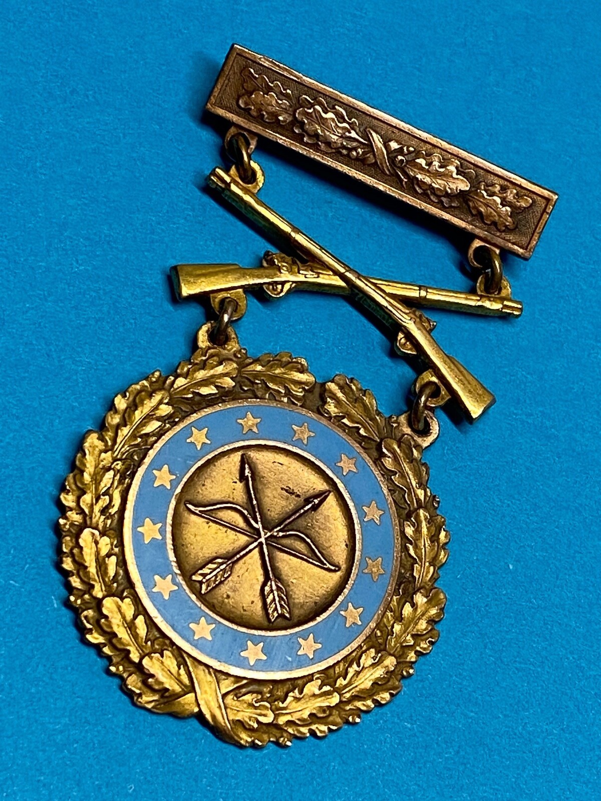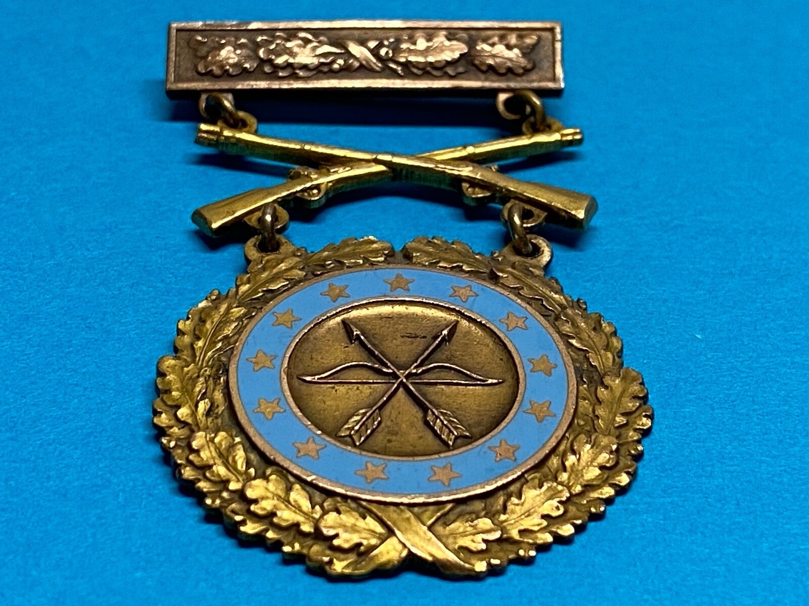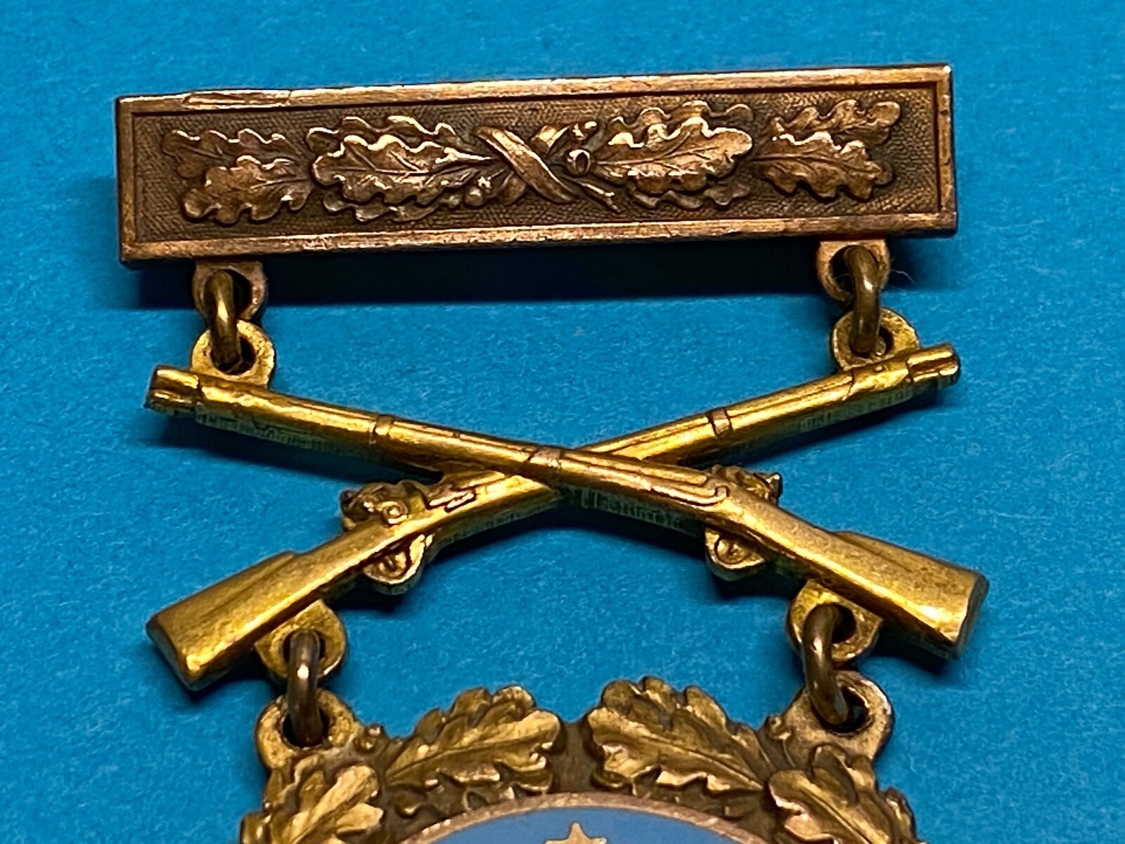 1. Top bar that indicated either Army level or Corps / department level competition and served as a brooch to affix the assembled device to the uniform. The top bar is squared ended and ornamented with oak leaves, and was always worn with this bronze clasp and an enameled planchet prior to WWII. The top bar or brooch is a pin back with a functional rotating clasp closure.