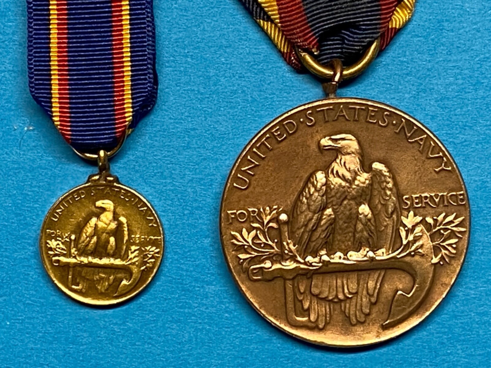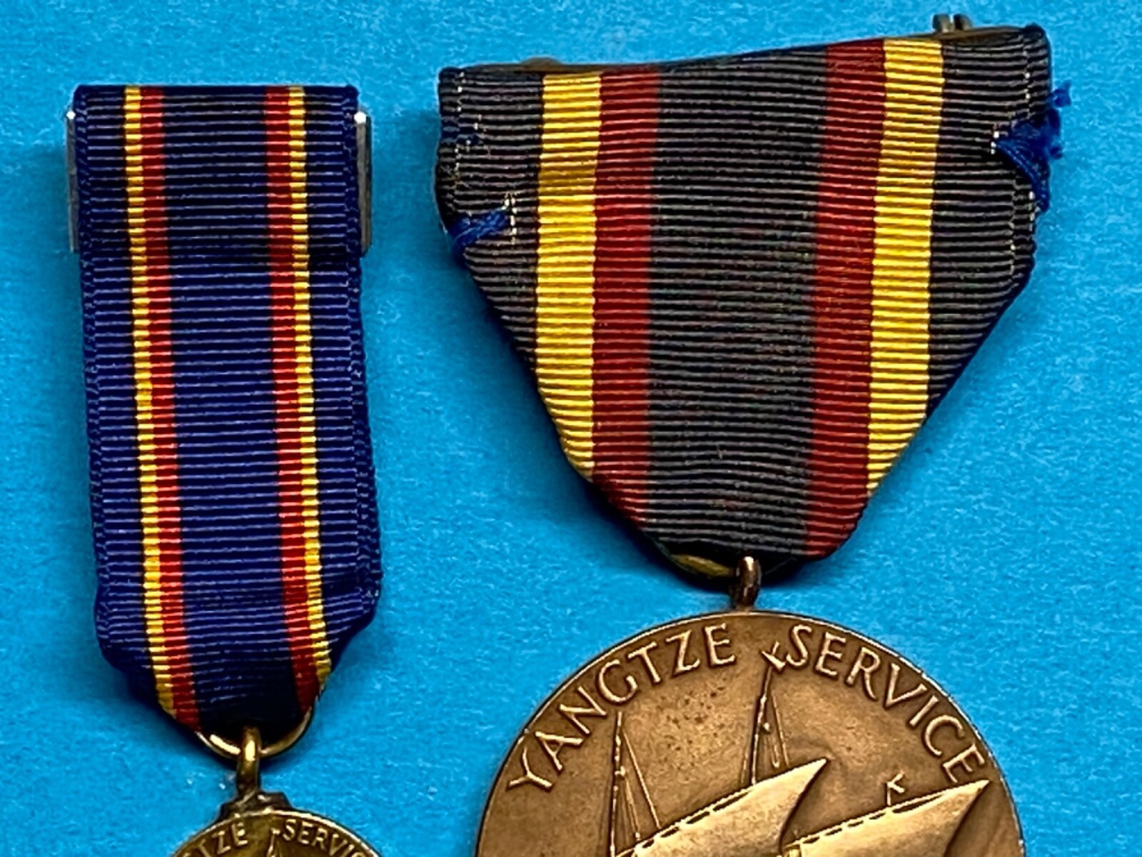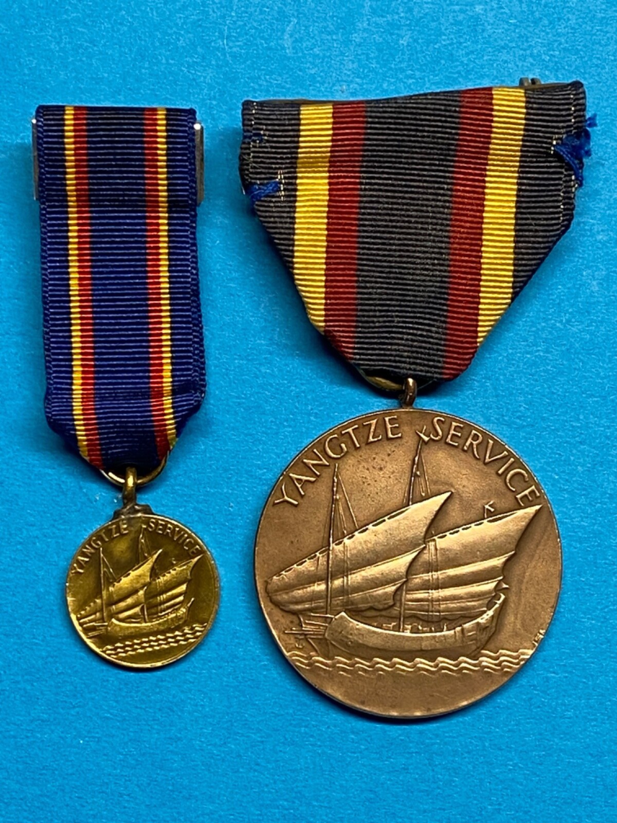 The bronze medallion features a Chinese junk asail. The inscription above the ship reads ?YANGTZE SERVICE.? The reverse side depicts a left-facing eagle perched on an anchor, and text reads ?UNITED STATES NAVY? and ?FOR SERVICE.? The ribbon is dark blue with two sets of red and gold stripes.