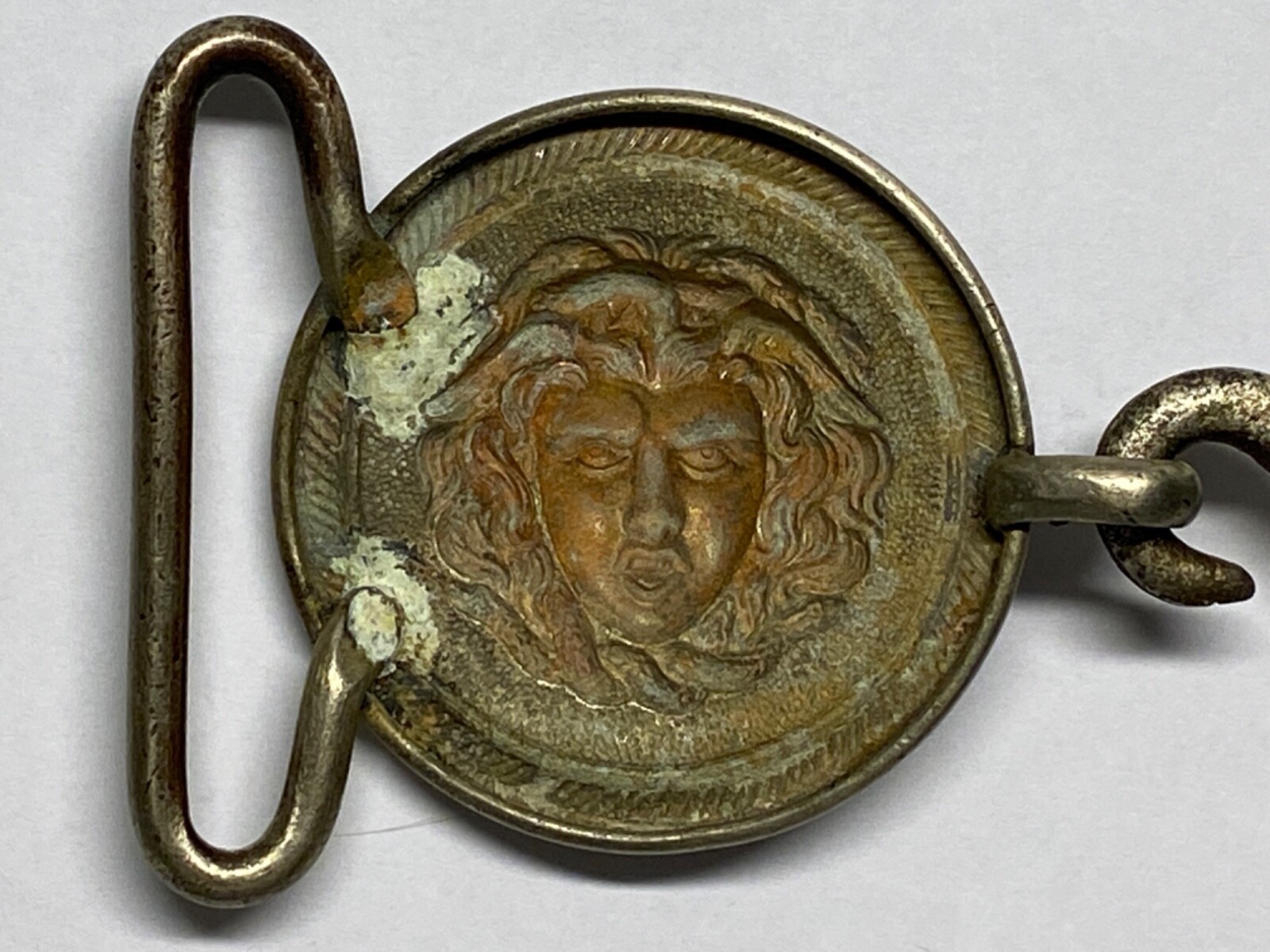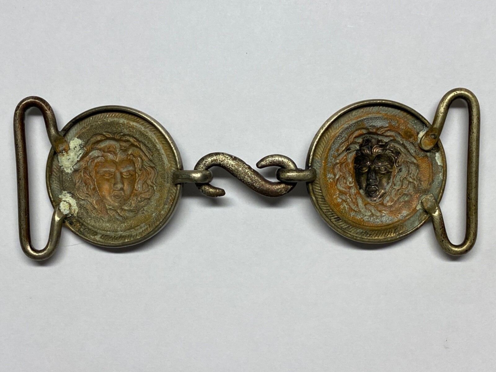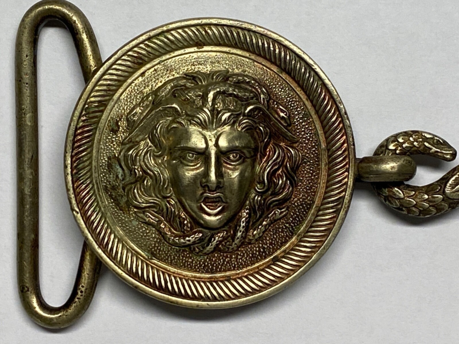 Scarce, original, good quality, buckle for an Officer?s sword belt. Medusa head buckle plates and snake clasp. The buckle consists of two large, finely made, circular classical bosettes depicting a finely cast and chased screaming Medusa mask, each measuring about 48mm in diameter. Nice patina and displays honest use and age. This dates from the French Second Empire. The face or head of Medusa appears for some reason in various French military ornaments and decorative touches, from bandoleers to swords. A very similar version can be seen in Michel Petard's 'Equipements Militaires Tome V de 1804-1815', p49, fig 457. Model 1831, circa 1850.