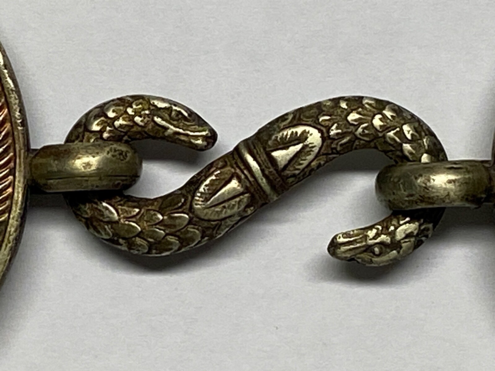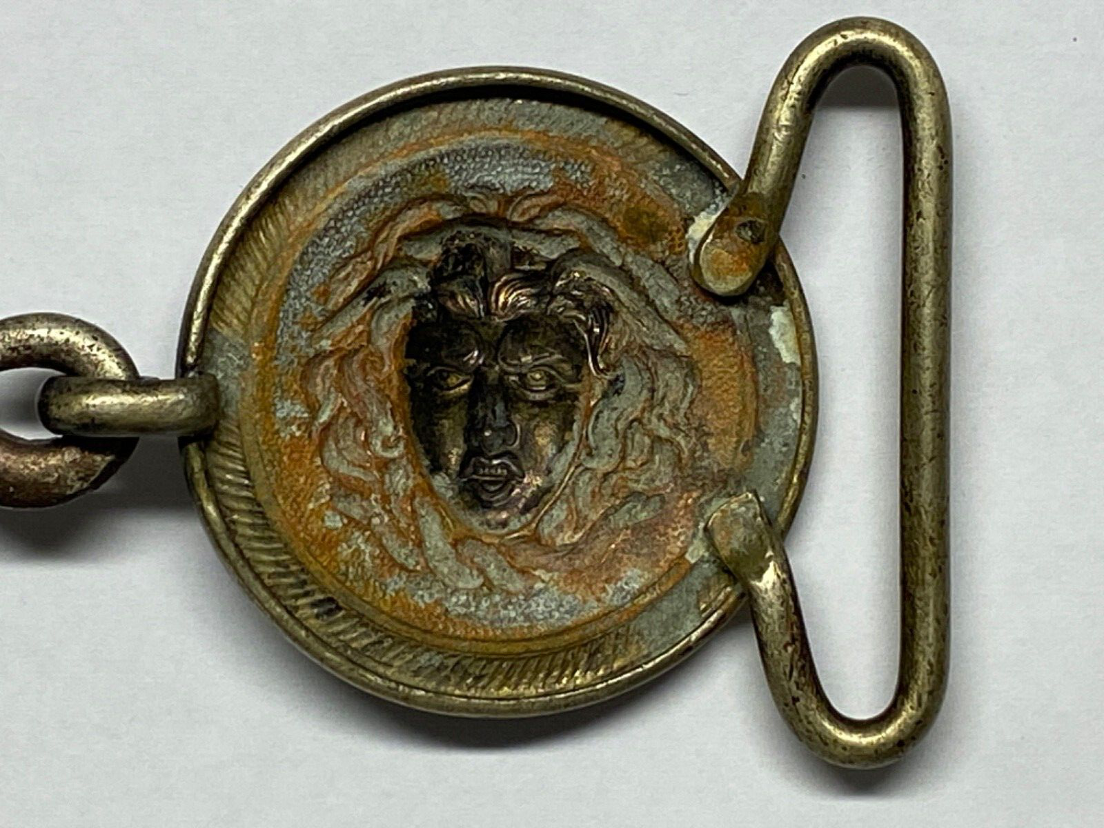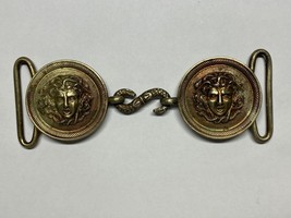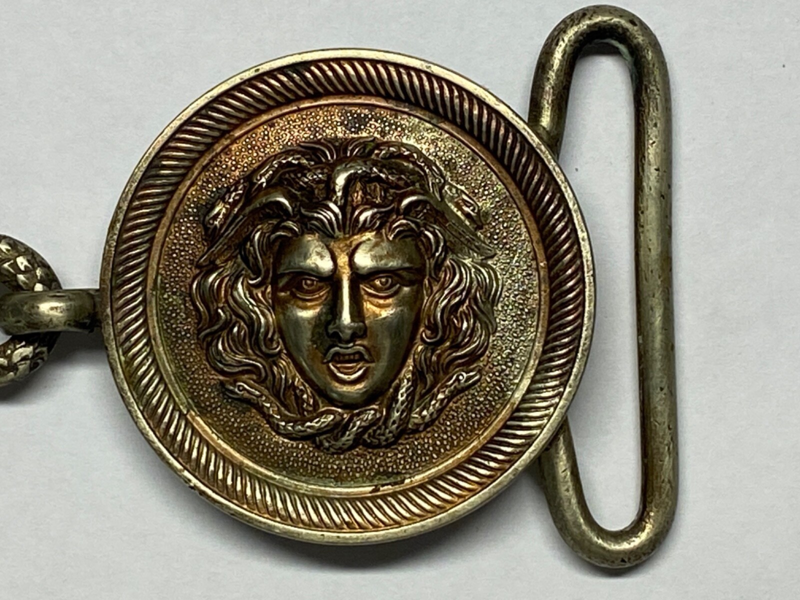 Scarce, original, good quality, buckle for an Officer?s sword belt. Medusa head buckle plates and snake clasp. The buckle consists of two large, finely made, circular classical bosettes depicting a finely cast and chased screaming Medusa mask, each measuring about 48mm in diameter. Nice patina and displays honest use and age. This dates from the French Second Empire. The face or head of Medusa appears for some reason in various French military ornaments and decorative touches, from bandoleers to swords. A very similar version can be seen in Michel Petard's 'Equipements Militaires Tome V de 1804-1815', p49, fig 457. Model 1831, circa 1850.
