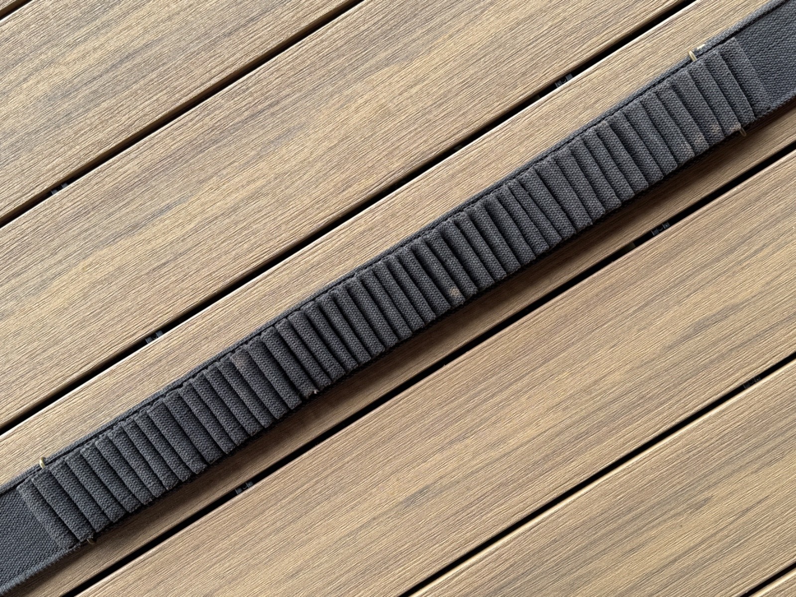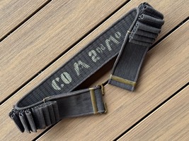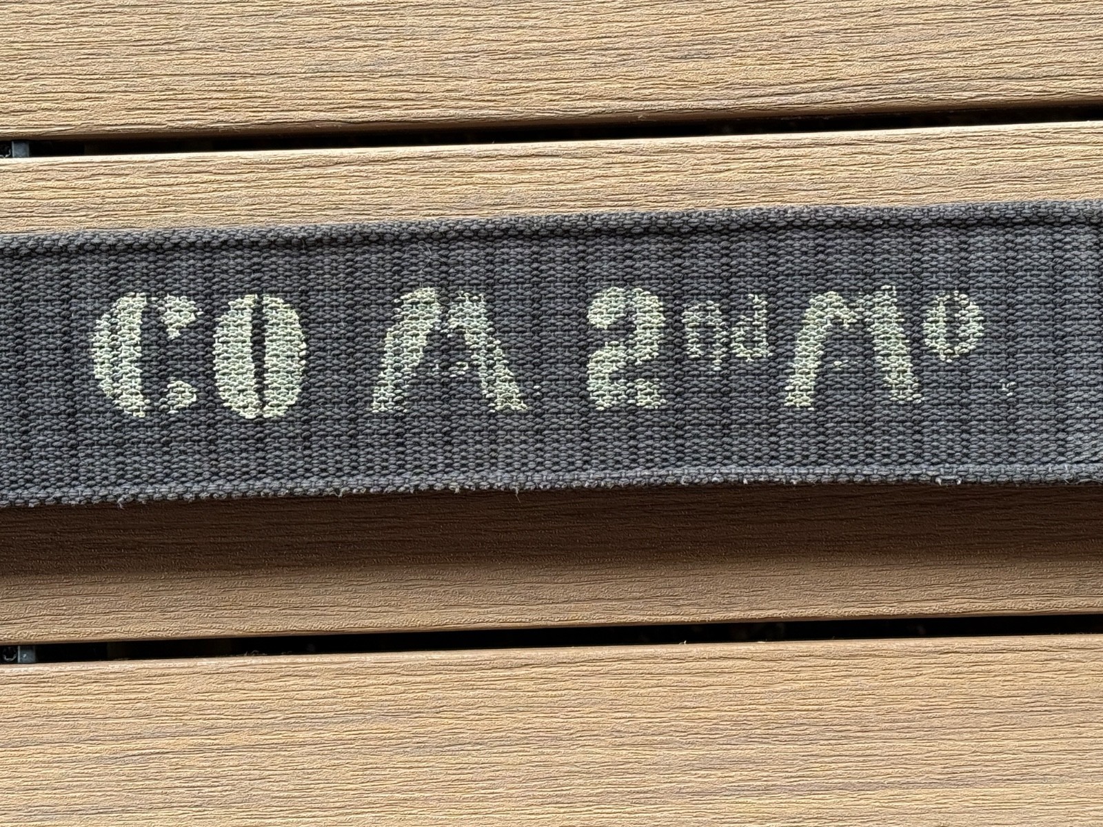 Original period manufacture. This is a woven, adjustable dark blue colored belt with 50 double loops which hold 100 rounds of Krag .30-40 caliber cartridges. Unit marked "CO M, 2nd Mo" (Company M, 2nd Missouri). The soldiers number "46" is also visible.