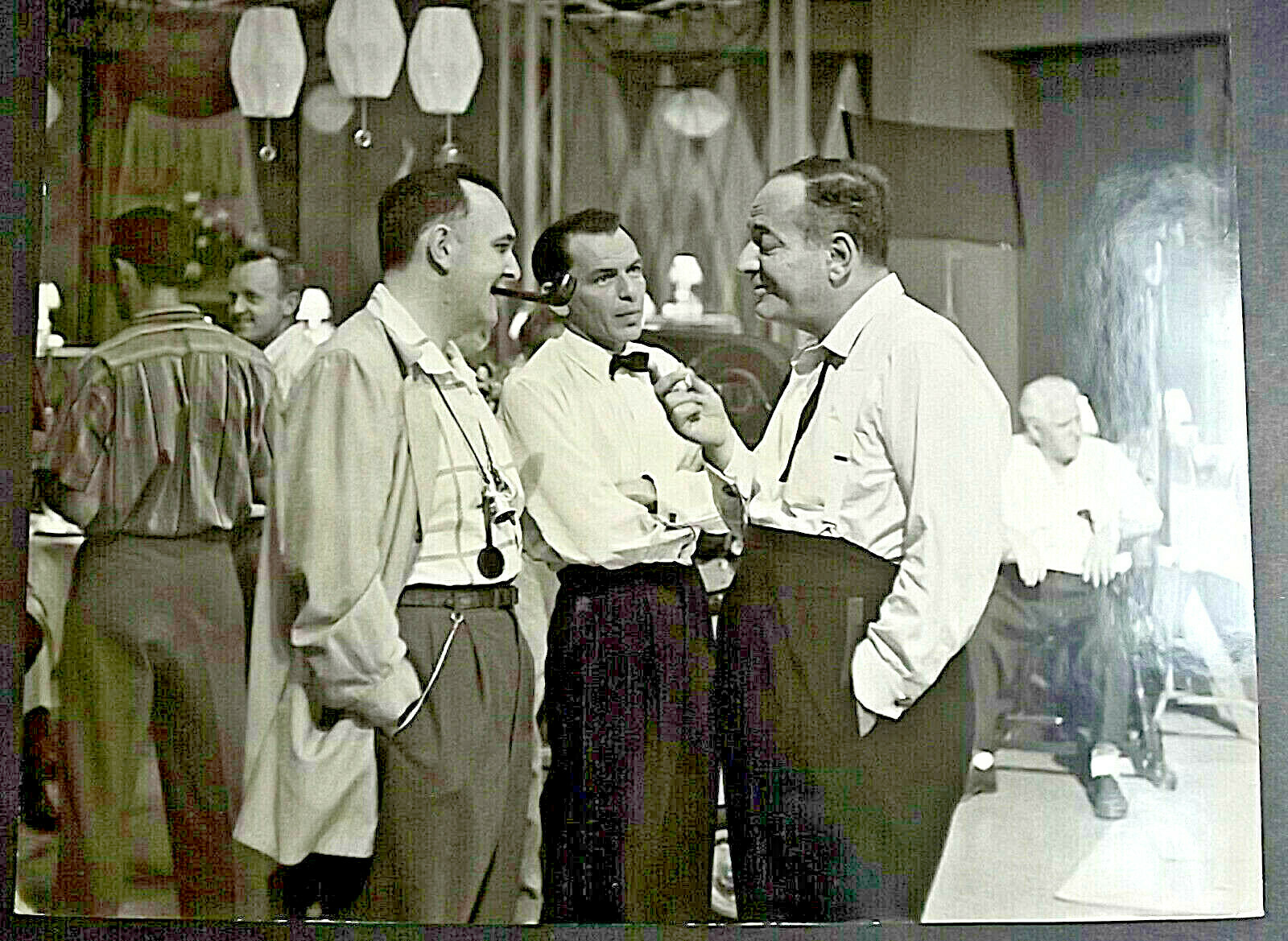 FRANK SINATRA: (PAL JOEY) ORIGINAL UNSEEN 1957 ON THET SET 11X14 SIZE PHOTO THESE RARE LARGE SIZE PHOTO FROM THIS CLASSIC FRANK SINATRA FILM ON THE SET WITH THE DIRECTOR AND ONE OF THE ACTORS FROM THE FILM,WITH STAMPS ON BACK OF PHOTO