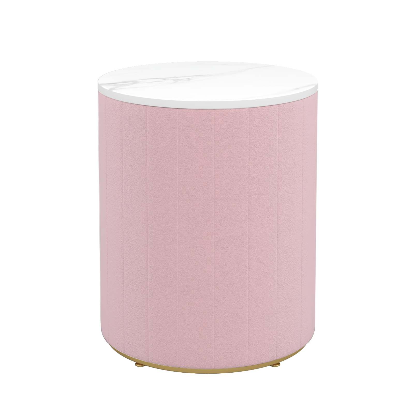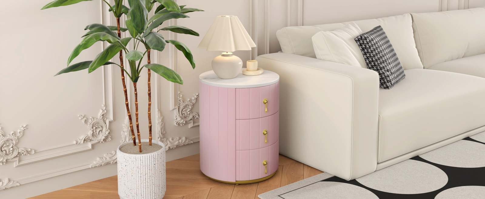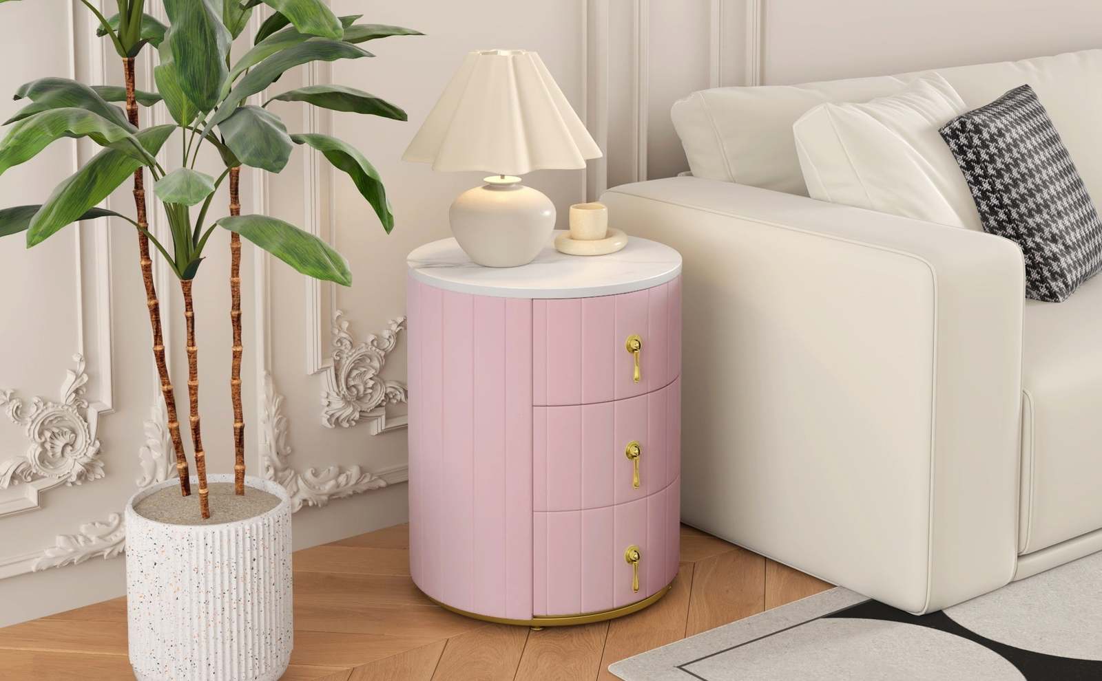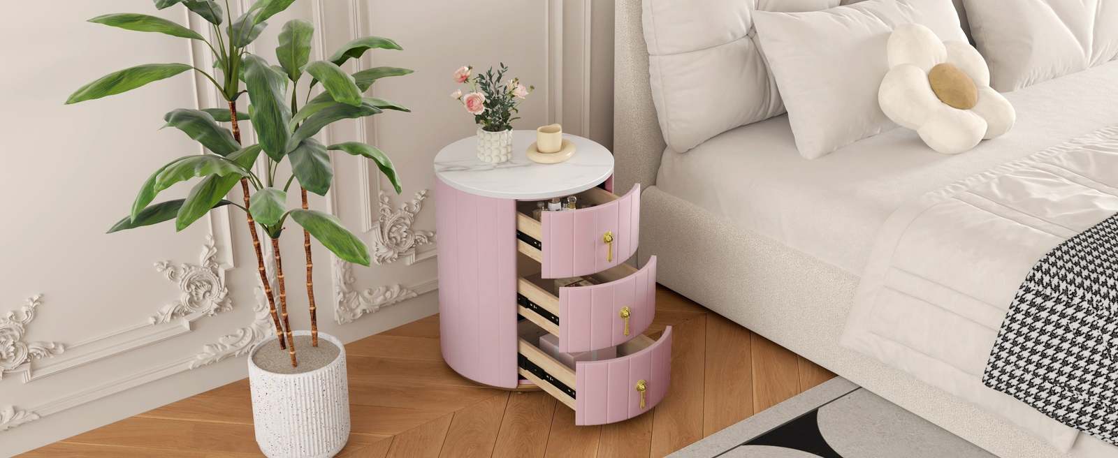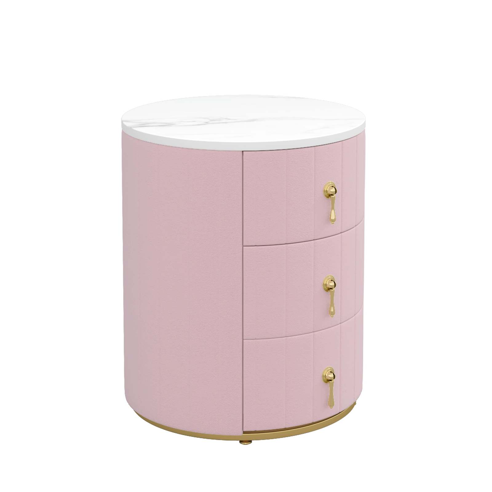 Pink Upholstered Round 3-Drawer Nightstand, Marbled Top