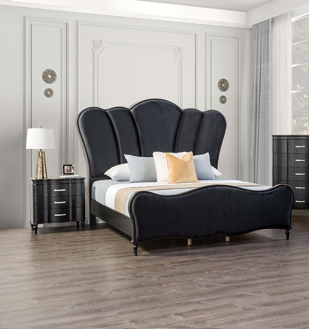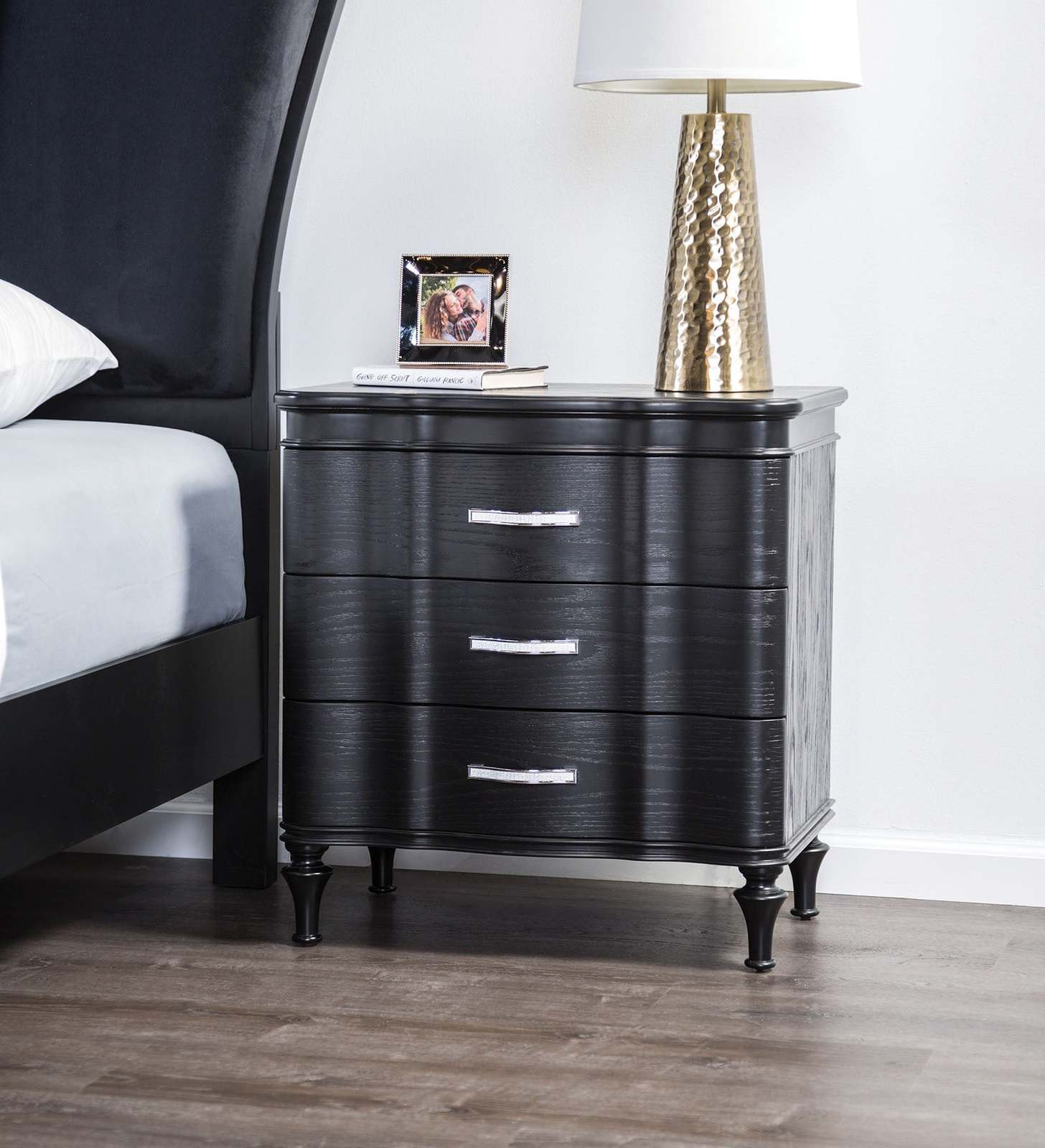 Step into glamour with the bedroom collection, evoking art deco nostalgia through scallop-style channel tufting, upholstered unique headboard(optional bed), and embellished chrome handles. This nightstand features serpentine front panels gives luxurious look to your relax room.