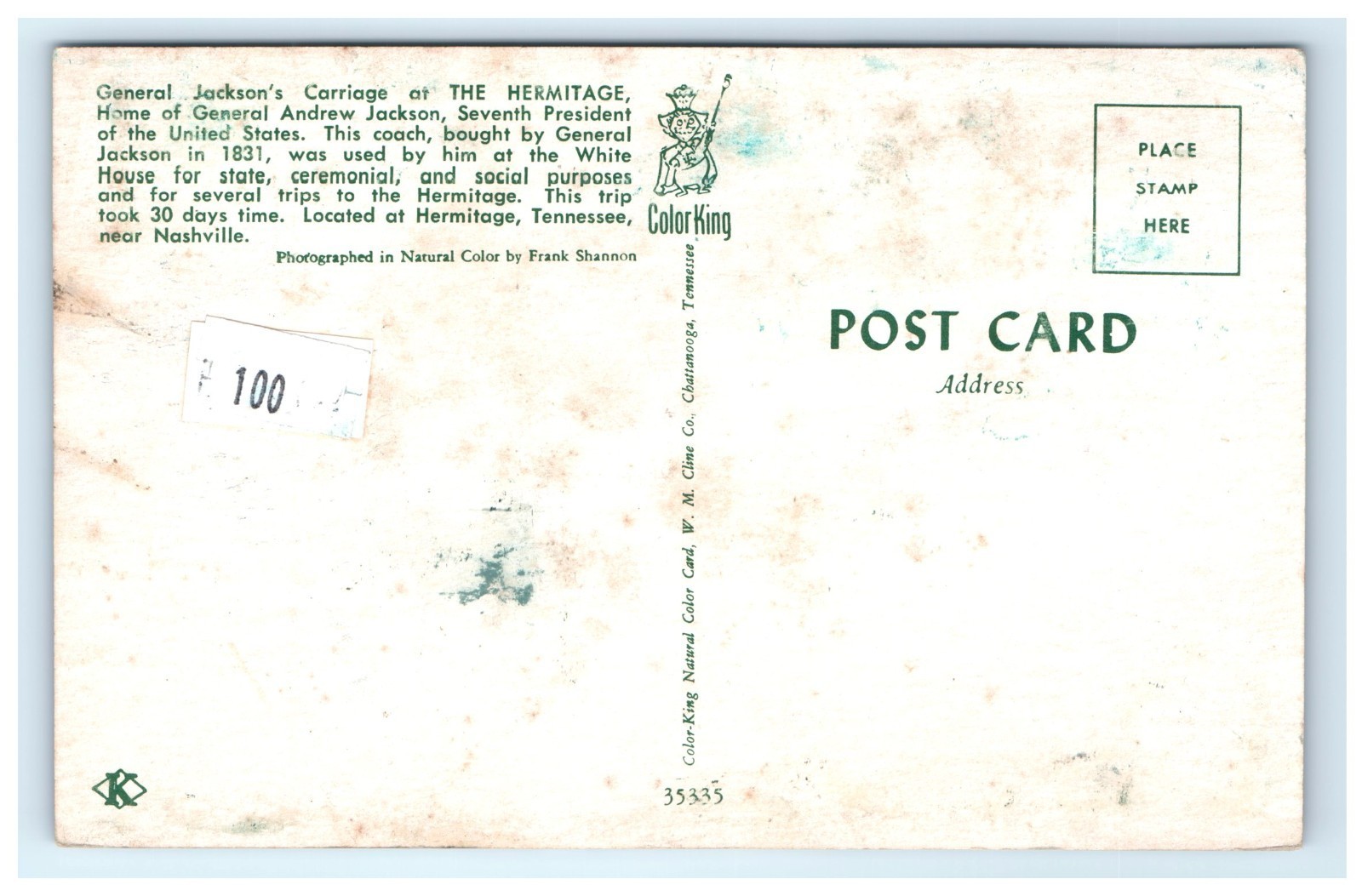 This card depicts General Andrew Jackson?s carriage on display at The Hermitage, his historic Nashville estate. The coach, purchased in 1831, was used for ceremonial and social purposes as well as trips between Washington and Nashville.