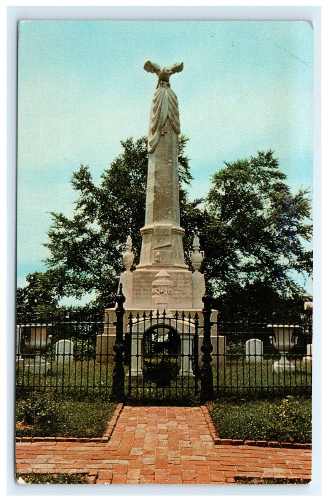 This postcard shows the tall marble shaft monument marking the tomb of President Andrew Johnson in Greeneville, Tennessee, inscribed with symbolic phrases and enclosed by iron fencing.