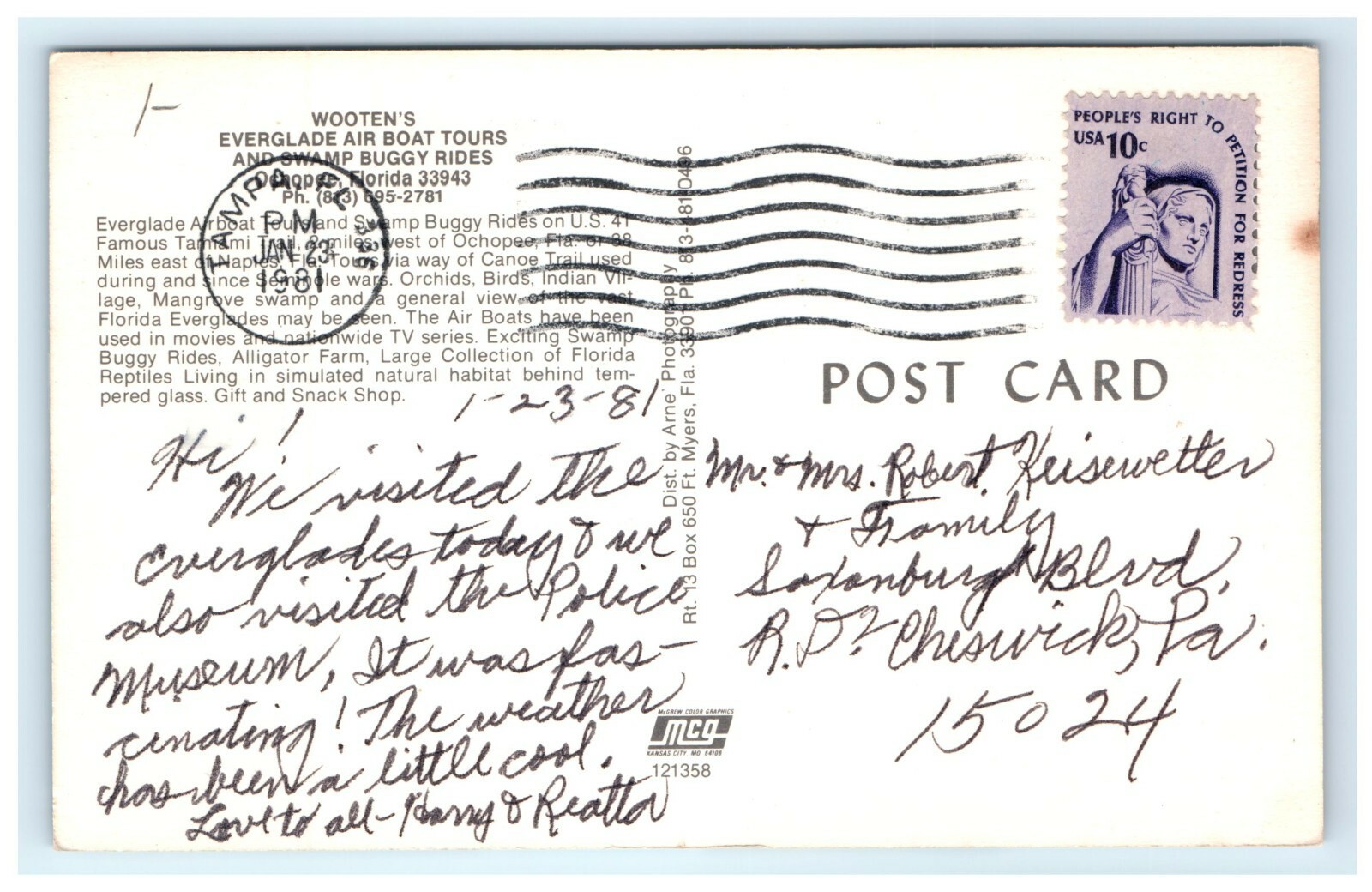 Back: Used, mailed 1981, 10 stamp, detailed advertising back for Wooten?s Everglade Air Boat Tours and Swamp Buggy Rides, distributed by Anne?s Photography, Fort Myers FL