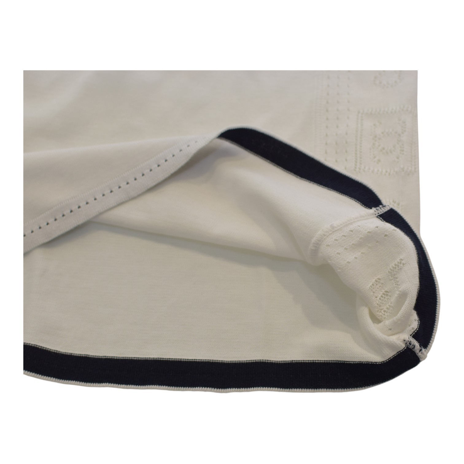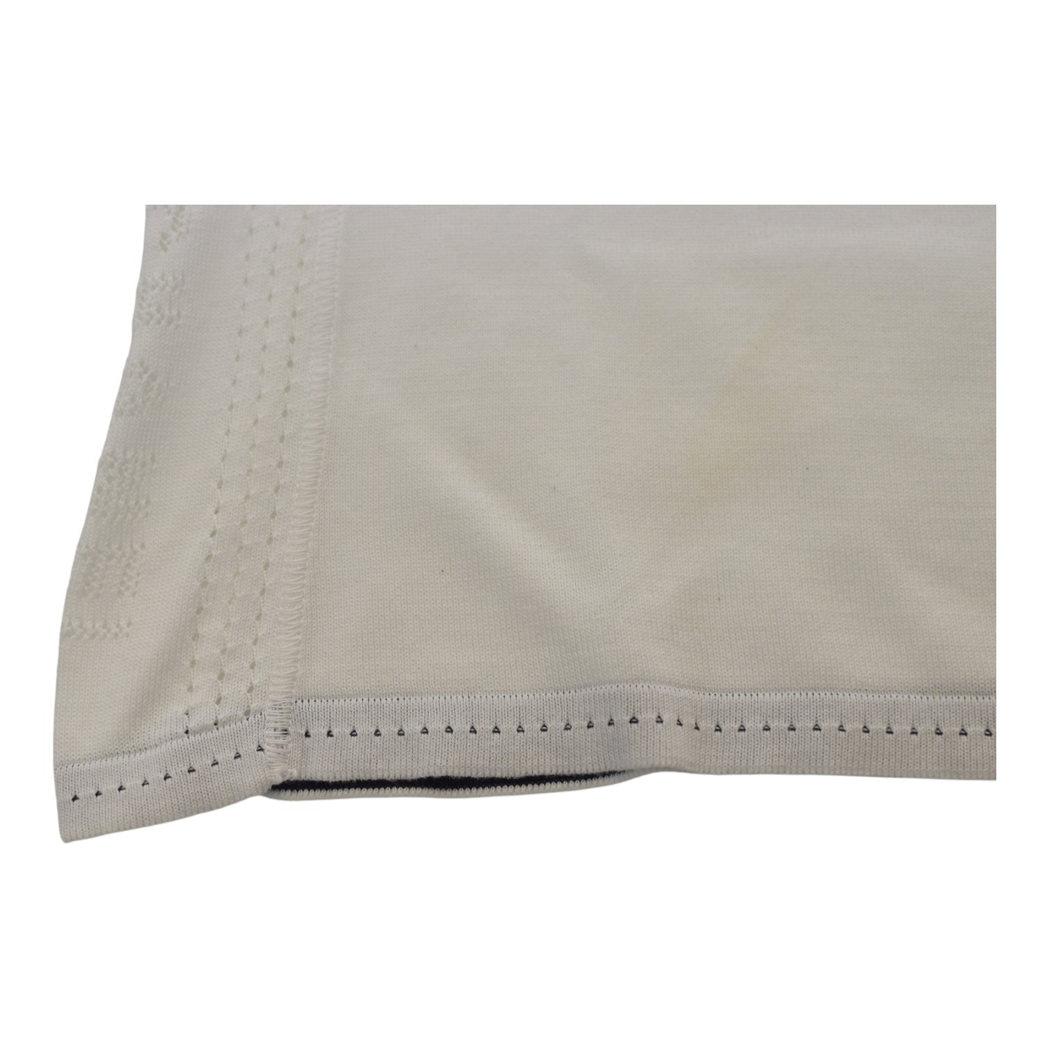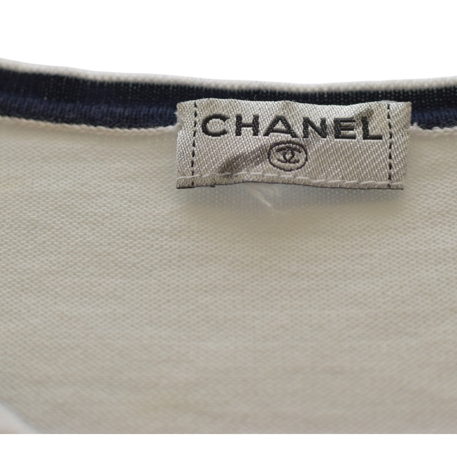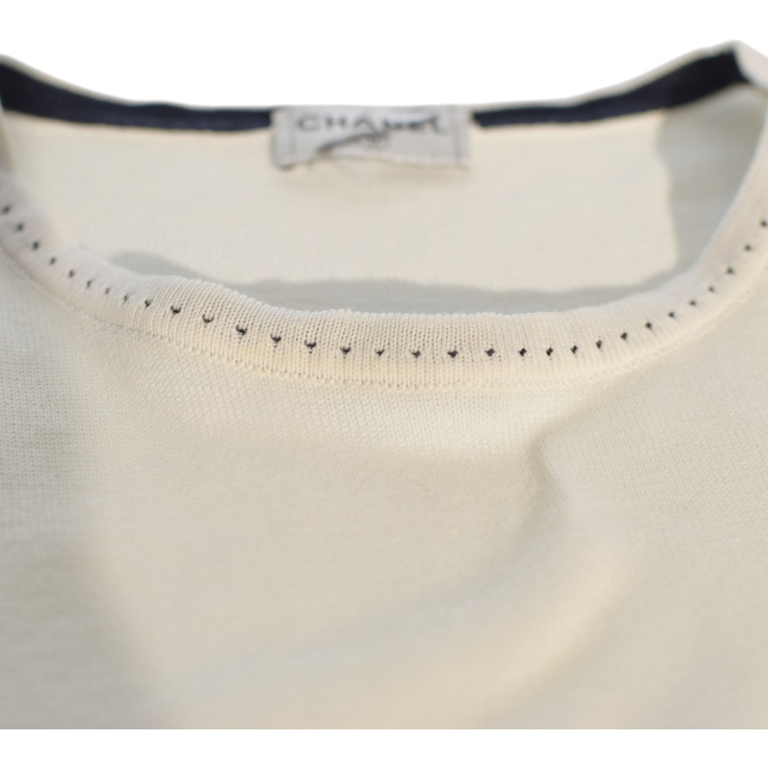 The product is a vintage Chanel white slim cut sleeveless top in size XS. This blouse features white fabric with black stitching details, making it a stylish and timeless addition to any wardrobe. Made from 100% cotton knit fabric, this pullover top, regular fit and basic style makes it perfect for casual occasions or travel during the summer, fall, or spring seasons. Made in France, this Chanel top embodies classic luxury and sophistication in a timeless design.