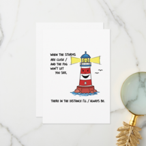 Send a beacon of hope with this charming, illustrated lighthouse greeting card, perfect for offering encouragement and reminding someone you care. The lighthouse, personified with a friendly smile, sends out its beam with the message: "WHEN THE STORMS ARE CLOSE / AND THE FOG WON'T LET YOU SEE, / THERE IN THE DISTANCE I'LL / ALWAYS BE." This high-quality flat card is ideal for friends, family, or anyone going through a rough time, offering a heartfelt message of friendship, support, and a consistent presence. A wonderful all occasion greeting card that says "I'm thinking of you" when they need it most.