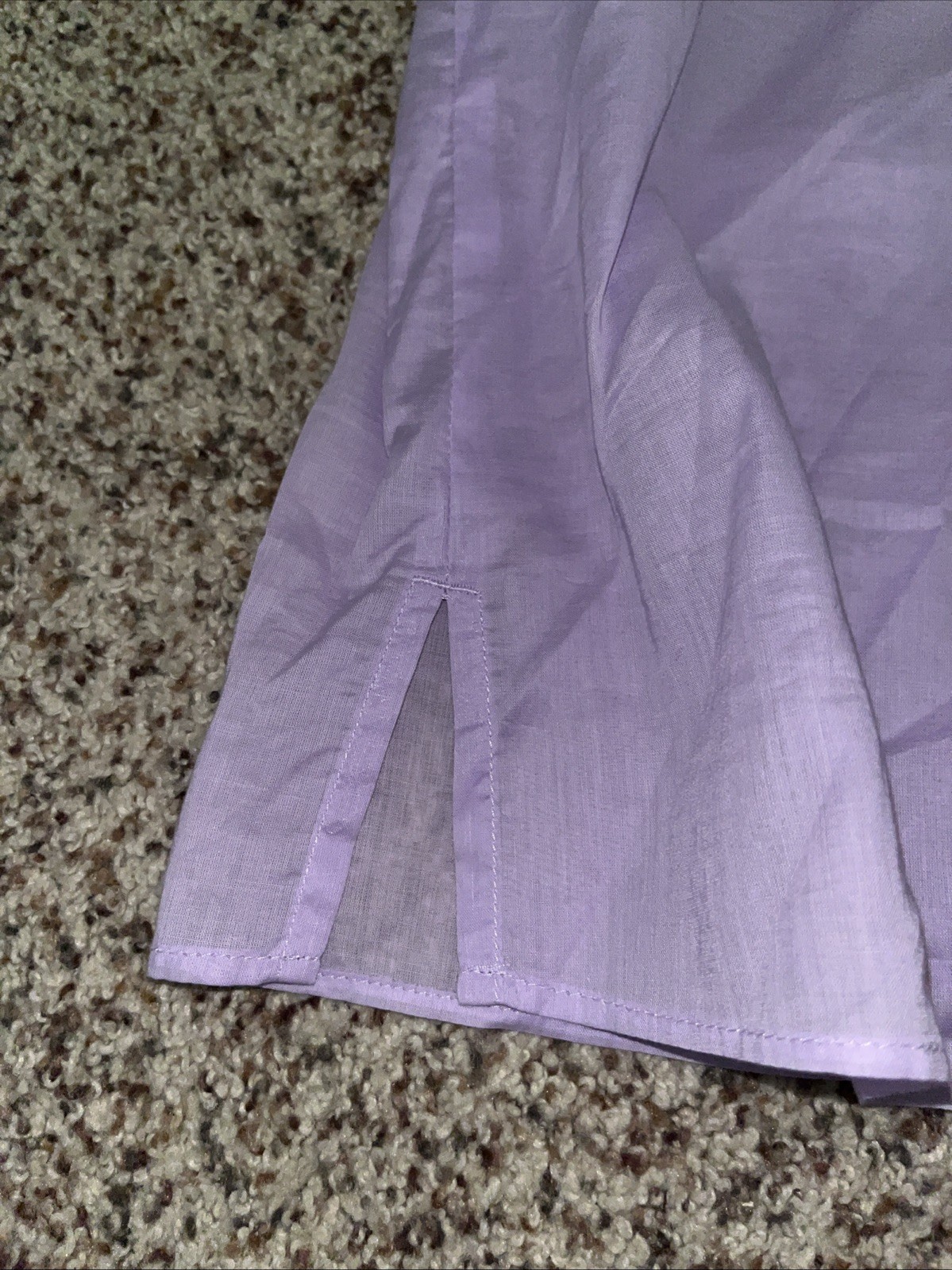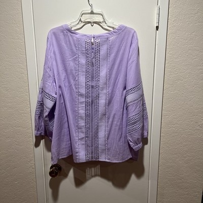 The Talbots Plus Lavender Lace Striped Cotton Blouse in size 2X is a stylish and comfortable addition to any woman's wardrobe. Made from 100% cotton with a woven fabric type, this blouse features a round neck, one button closure in the back, and 3/4 balloon sleeves. The lace accents add a touch of elegance to the relaxed fit, making it perfect for everyday wear. This blouse comes with a camisole cotton for added versatility and can be machine washed for easy care.