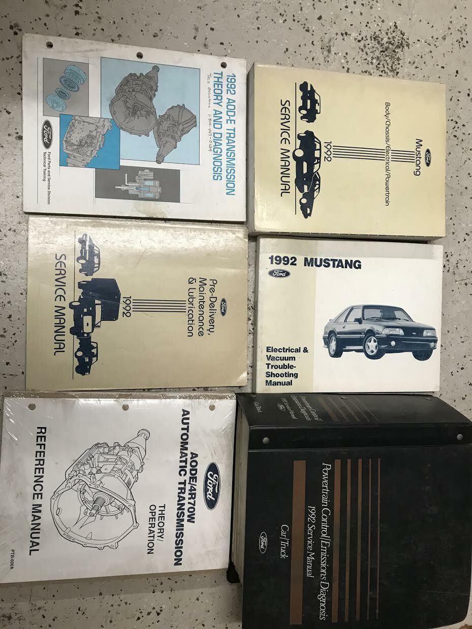 1992 MANUALE DI SERVIZIO Ford Mustang , Manuale di riferimento di trasmissione, Manuale di risoluzione dei problemi elettrici e sotto vuoto, Manuale di consegna, Manuale di riferimento di trasmissione, Manuale di addestramento alla trasmissione e Manuale di diagnosi di emissione del controllo del propulsore