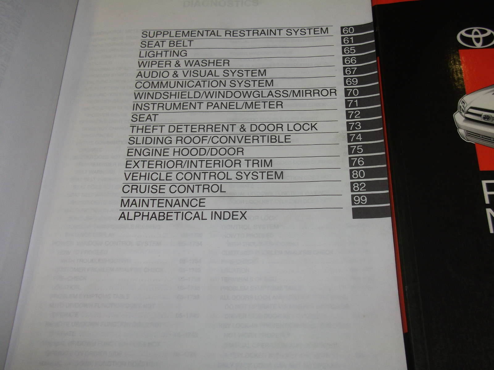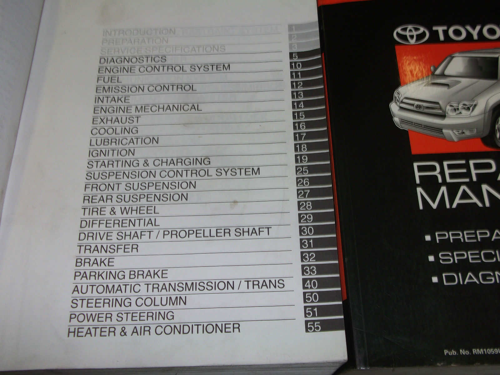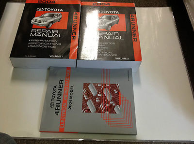 NEW Factory Authorized Reprint 2004 Toyota 4RUNNER Factory Service Manual Set SET INCLUDES Volume 2 covers Engine/Chassis/Body/Electrical/Maintenance/Diagnostics. Volume 1 covers Preparations/Specifications/Diagnostics. 2004 4runner Electrical Wiring Diagram Manual SAMPLE PHOTO