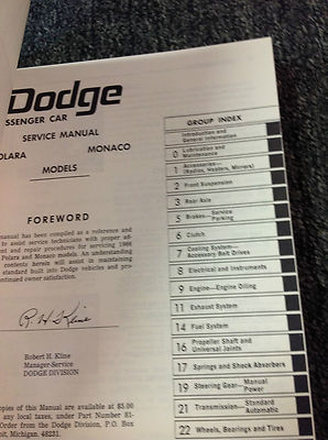 Pieno di informazioni e illustrazioni, istruzioni graduali, assemblaggio/smontaggio, illustrazioni/diagrammi esplosi/diagrammi/risoluzione dei problemi, ottimo manuale da avere quando possiedi una DODGE Polara/Monaco e manterra il tuo veicolo sulla strada. Questo manuale ti fara risparmiare denaro in riparazioni/servizio.