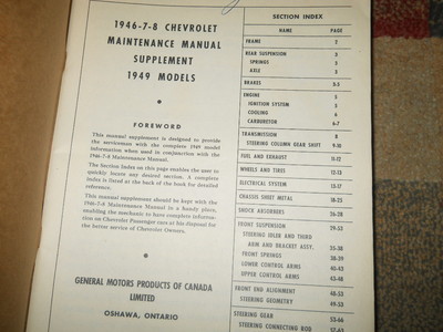 Supplemento utilizzato fino al 1946-1947-1948-1949 Supplemento di servizio per auto per passeggeri Chevy, stampato in Canada.