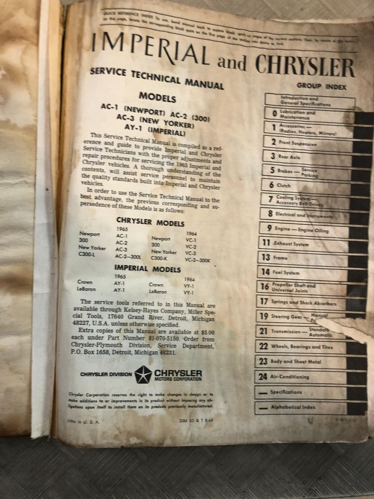 Factory 1965 Chrysler NEWPORT/300/IMPERIAL/CROWN/LEBARON Service Manual Mopar Want Book Service Manual is very worn as shown. Water damaged throughout. Spine damage and cover damage. We will leave POSITIVE Feedback after we receive your payment. Please do not forget to give us POSITIVE Feedback and FIVE Stars on all of the Detailed Seller Ratings! If you are not satisfied with your shopping Experience, please contact us to get a solution before you decide to leave a NEUTRAL or a NEGATIVE Feedback, We will do our best to solve any problems for you as soon as possible. We will provide you with the BEST POSSIBLE service because the POSITIVEFeedback and FIVE Stars are what we are striving for. Please email me through "My Messages" or "Ask Seller Questions" if you have any question about our