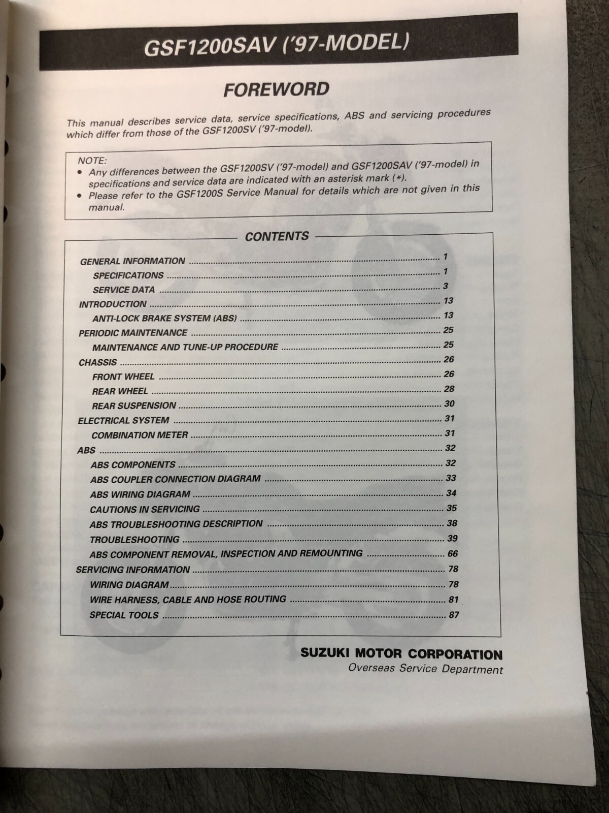 1997 SUZUKI GSF1200s Service Repair Officina Manuale (Foglia sciolta) e Supplemento GSF1200SA (ABS) 1997 (ABS)